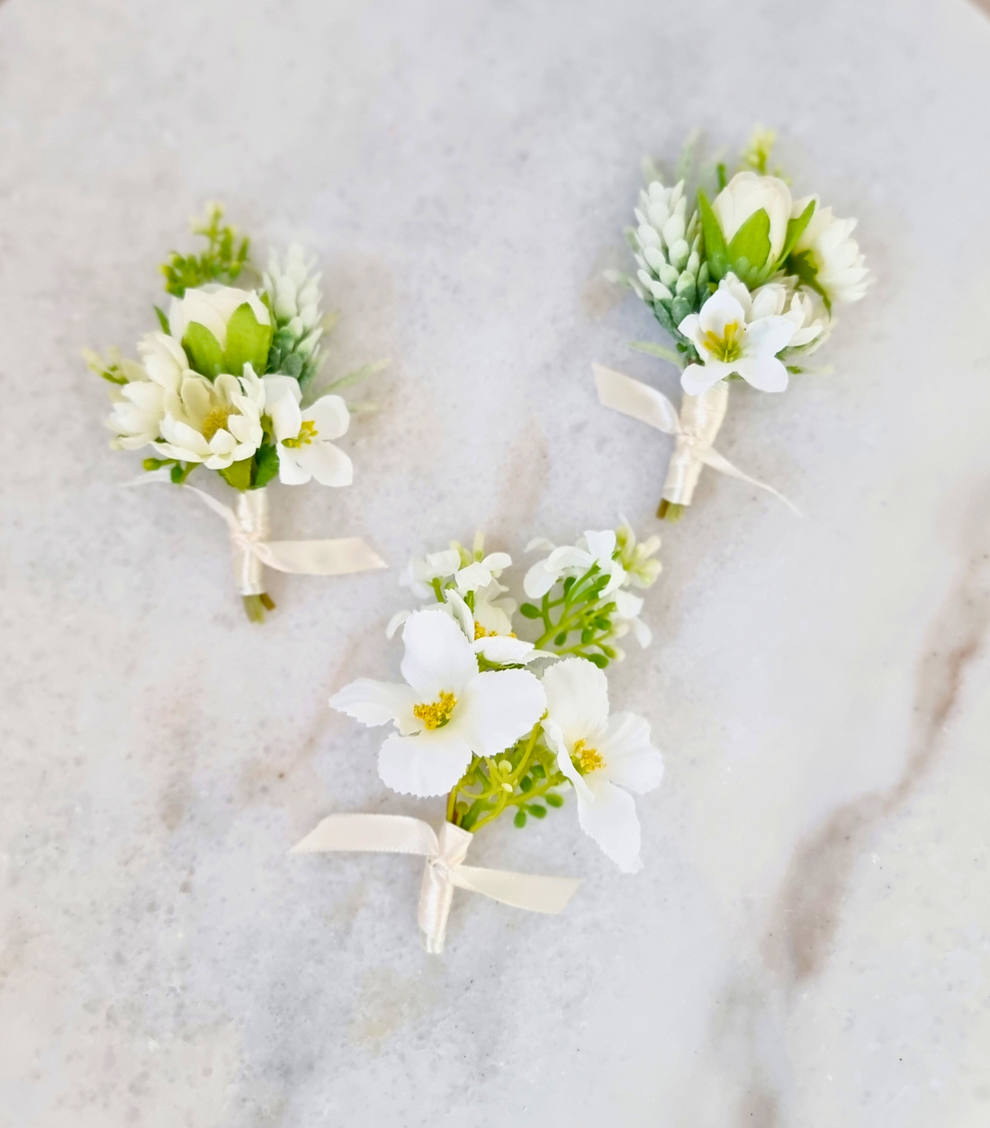 White and green silk wildflower boutonnières and corsages. Minimalist elegance and classic, perfect for a...
