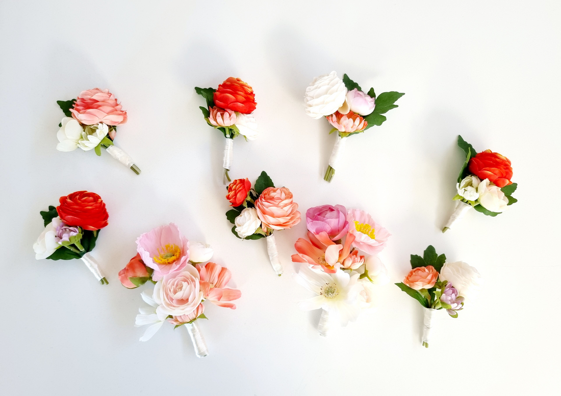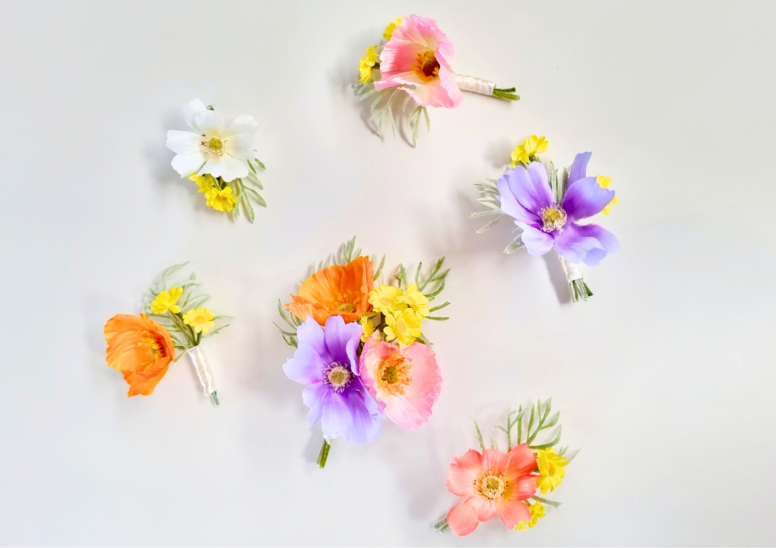 Colourful & bright silk flower boutonnières and corsages. Wildflowers like poppies, cosmos, daisies used for...