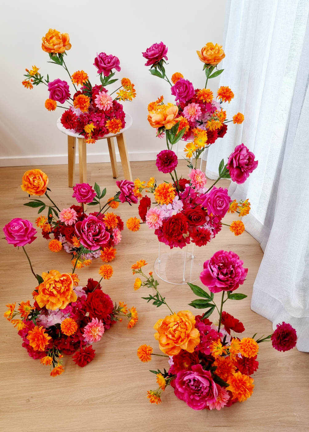 Bold pink purple orange artificial silk floral arrangements (front facing / 1-sided). These flower clouds...