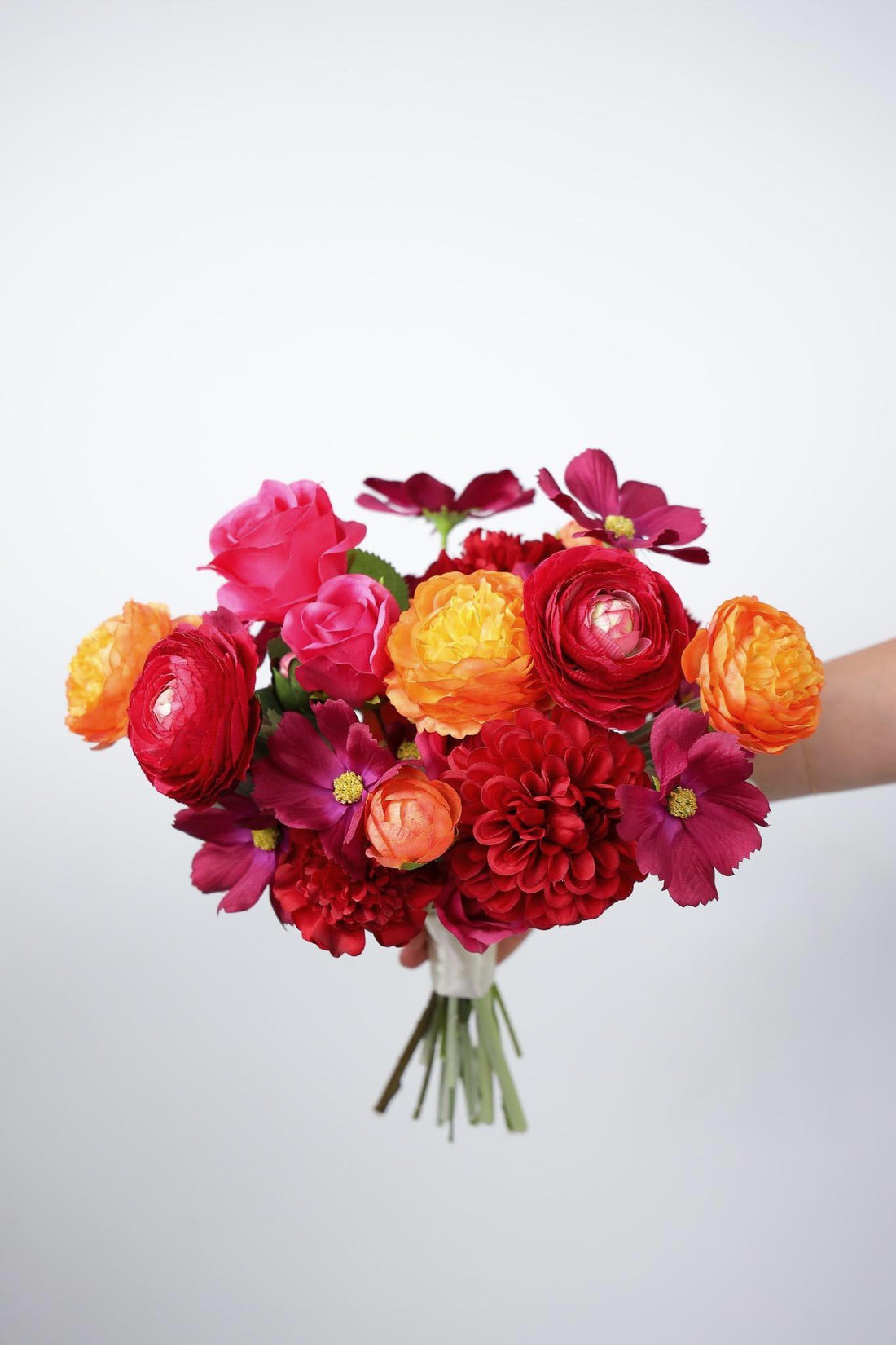 Pink orange blue colourful silk bouquet made with faux roses, bougainvillea and ranunculi in red,...