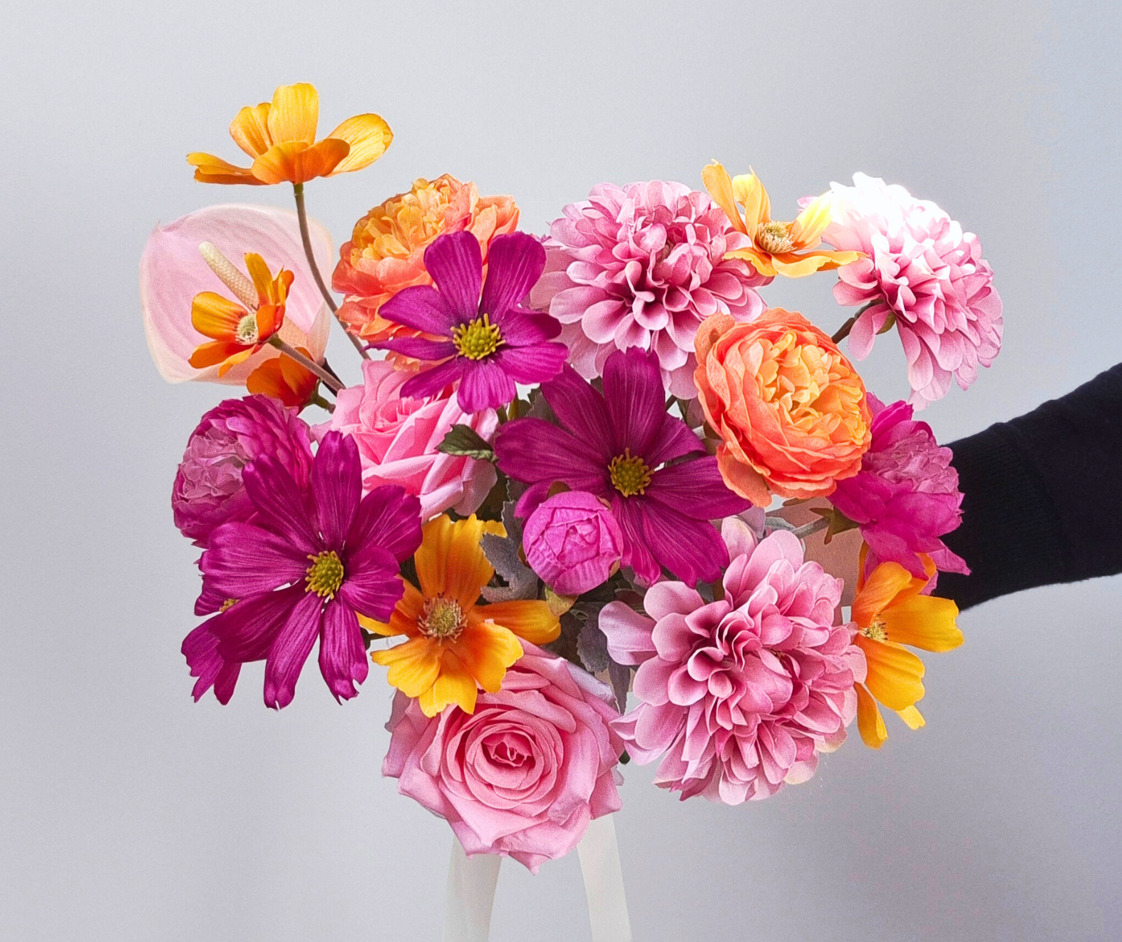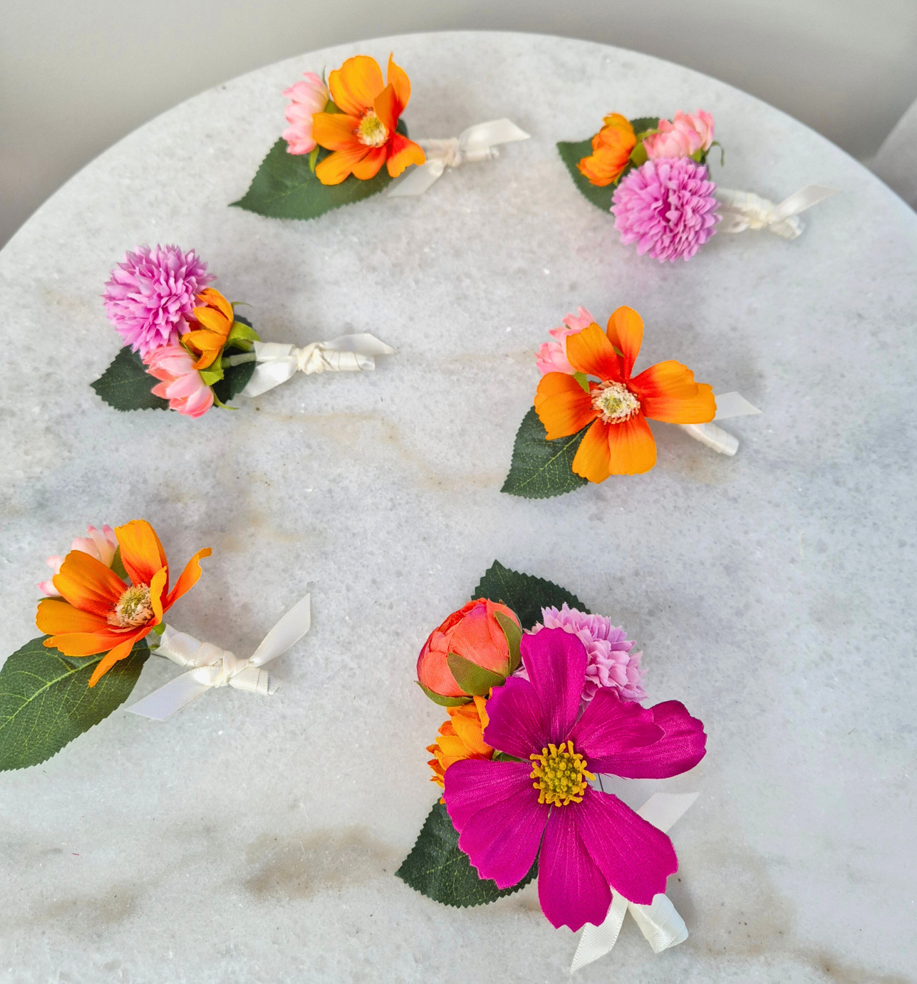 Bright bold pink orange modern artificial flower bouquet for wedding. Flowers include an assortment of roses, dahlias, daisies, ranunculus and wildflowers. Bridal bouquet and buttonhole are finished with an ivory ribbon.