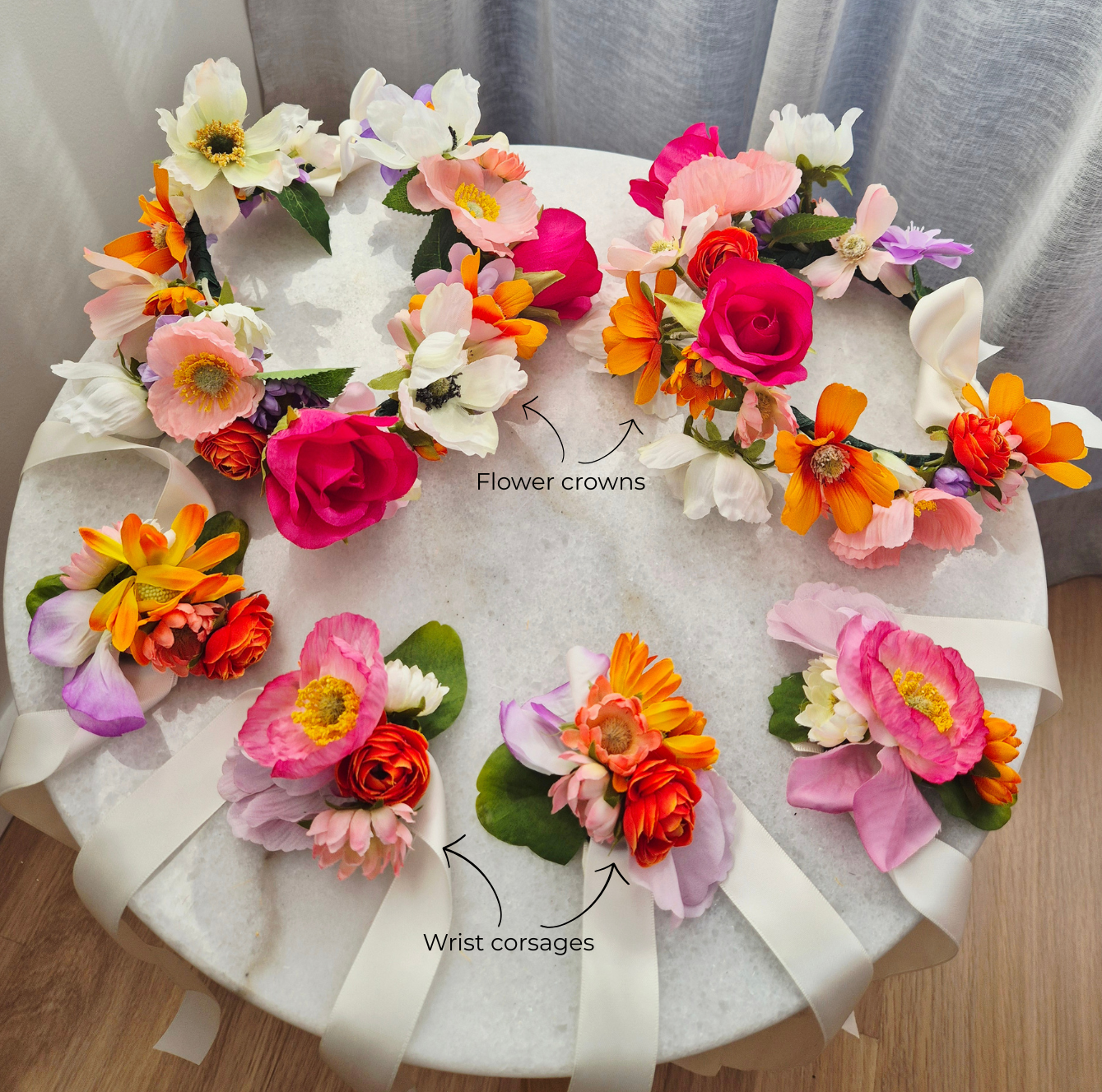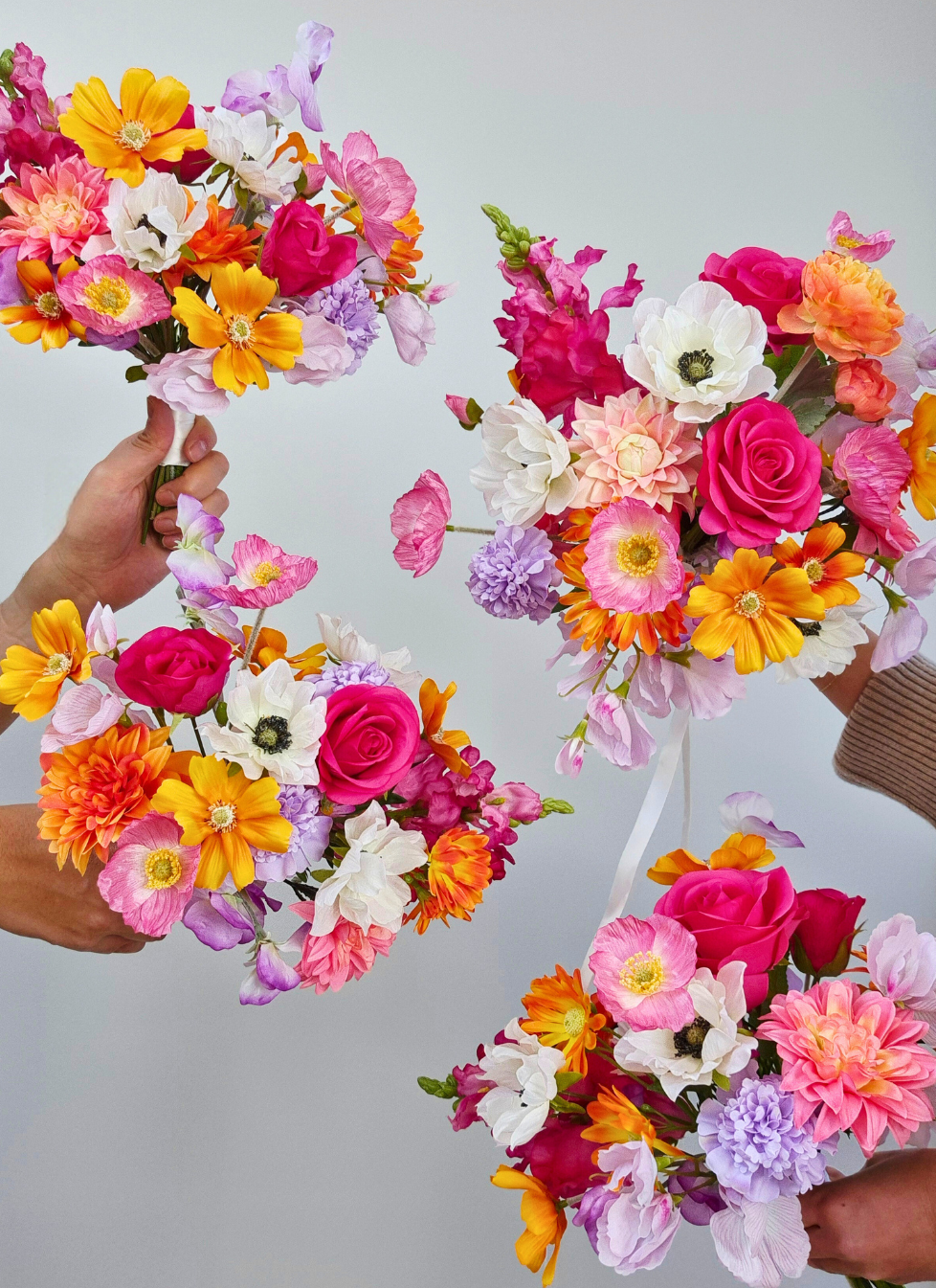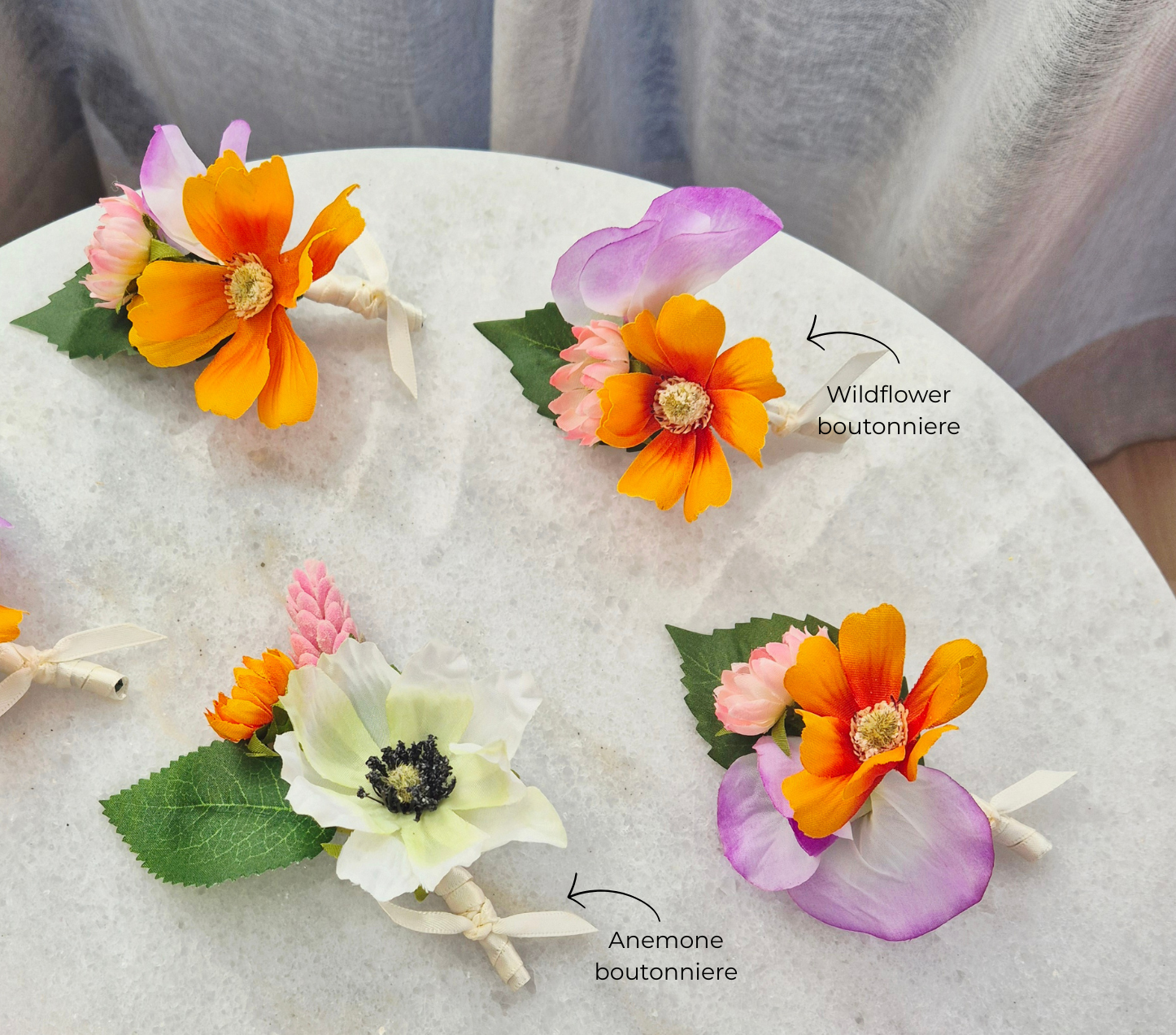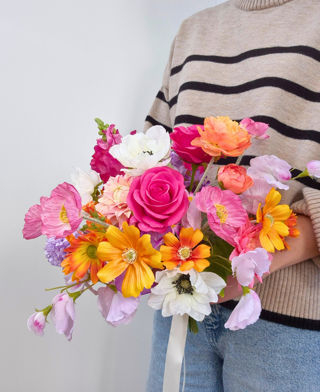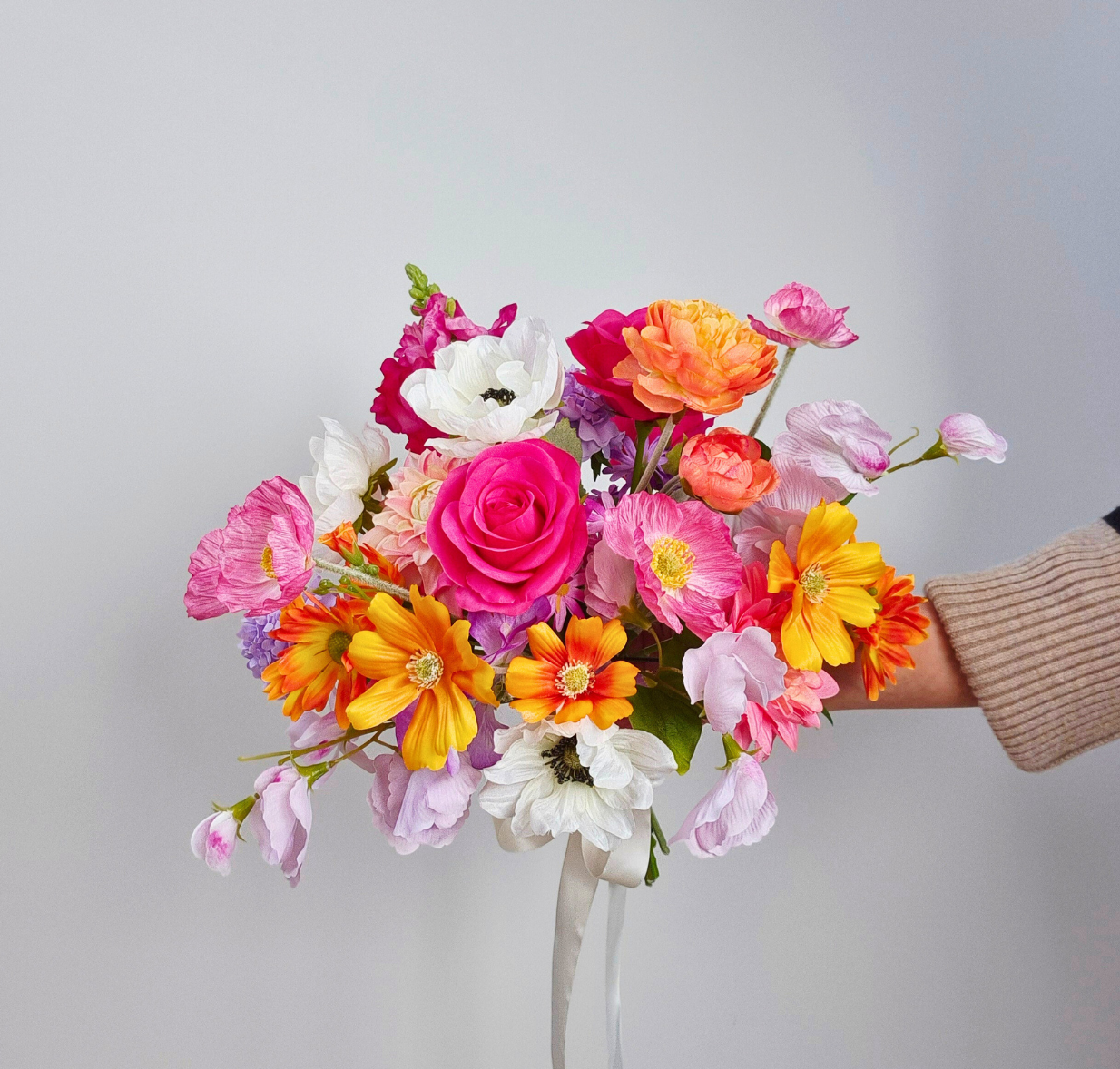 Garden inspired whimsical faux flower bouquet made with premium high-quality faux flowers (anemonies, poppies, ranunculus, wildflowers). Shades of orange and fuchsia / hot pink, with touches of white and purple. Shown in the photos are the Bridal and Bridesmaid bouquets.