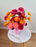 Bold orange pink and red faux flower bouquet with an assortment of peonies, roses, dahlias, daisies. Mix of bright citrus, hot pink / fuchsia and red colours.