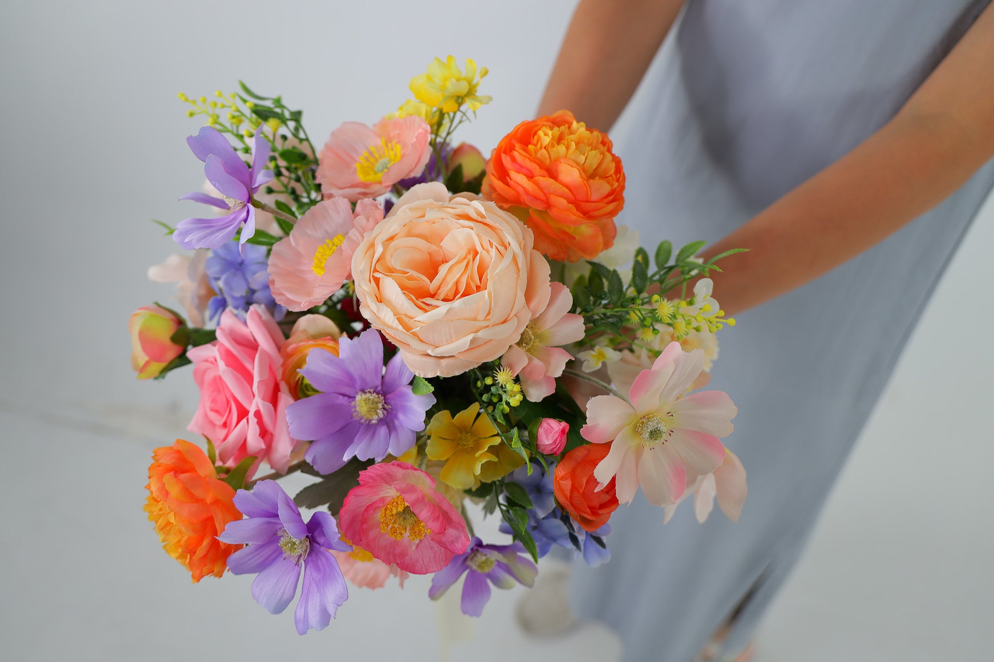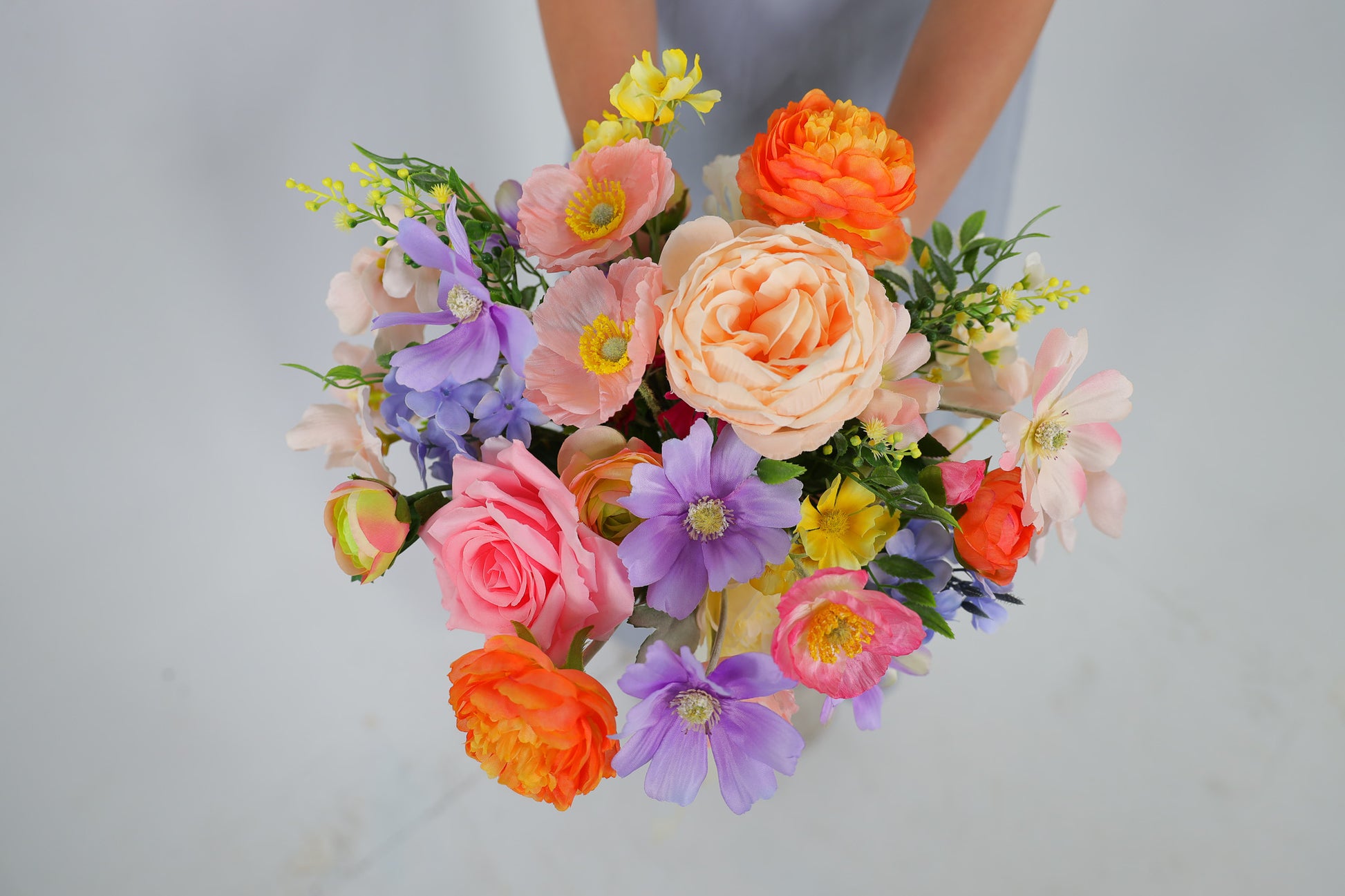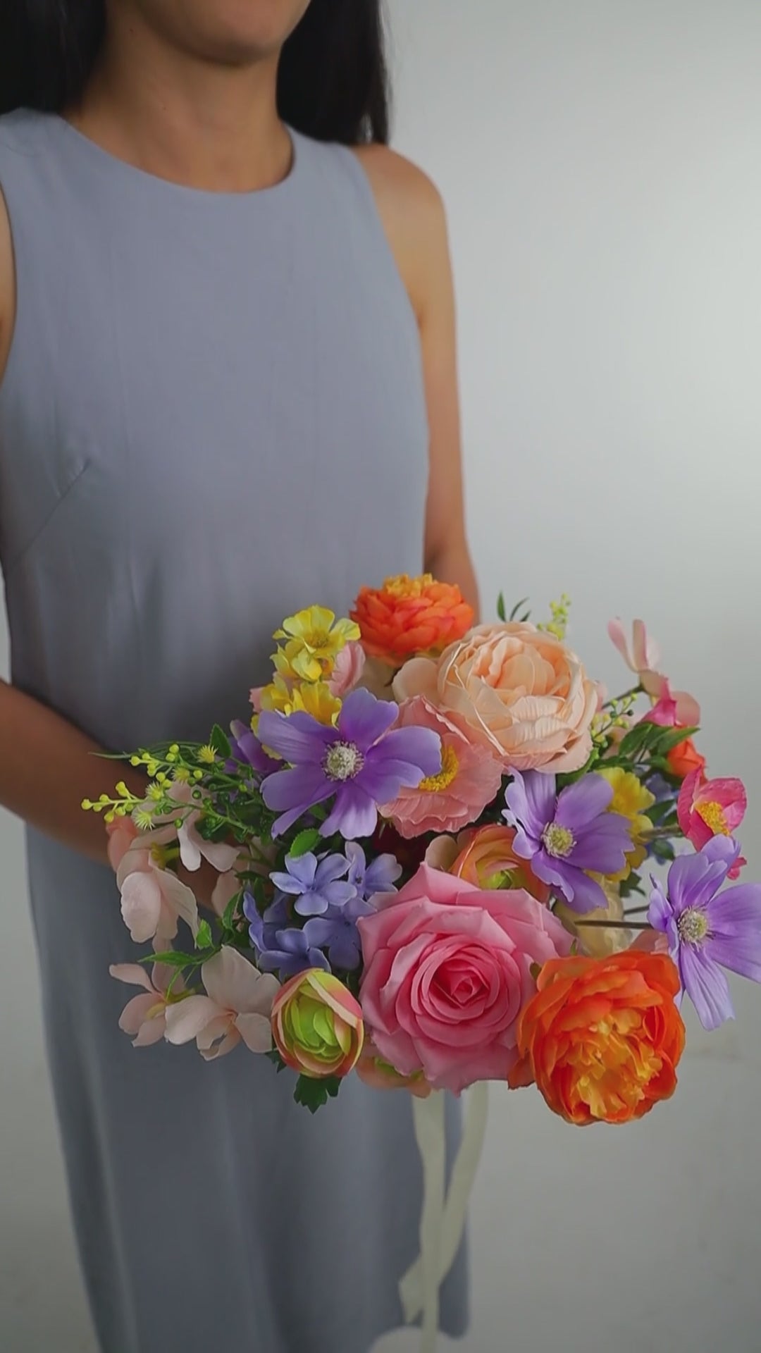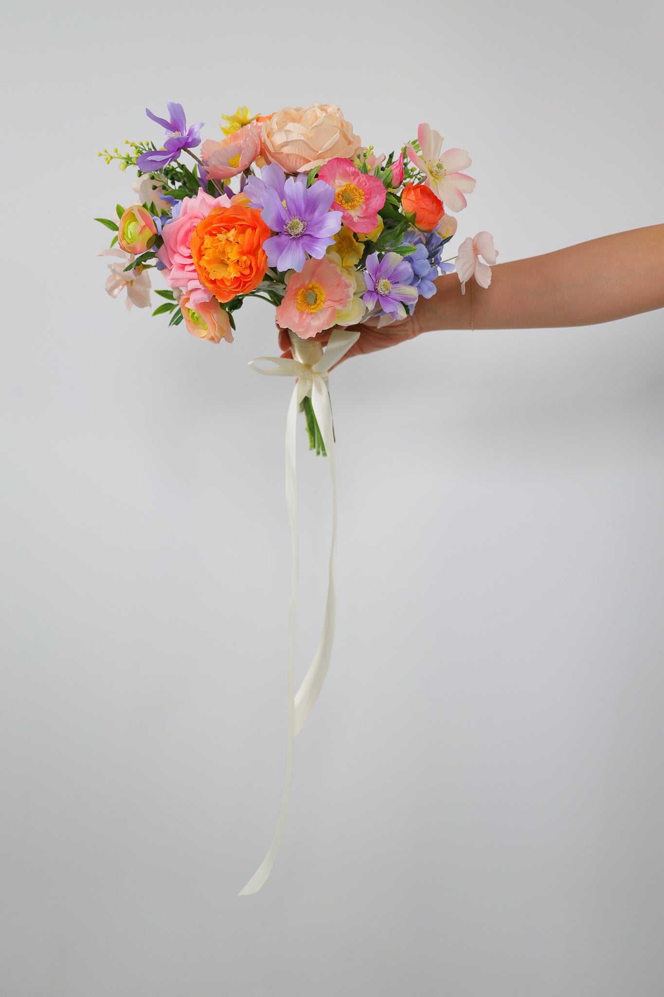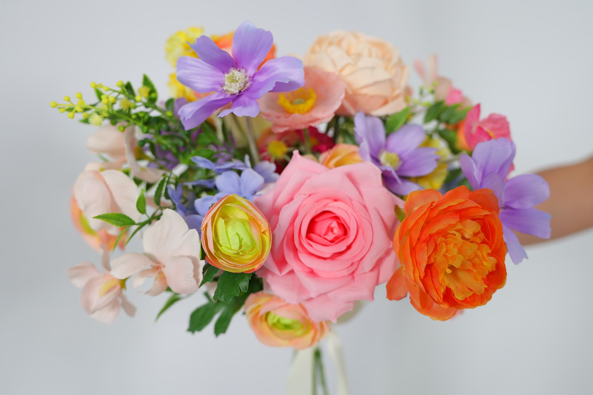 Brighten your special day with this silk wedding bouquet - a stunning blend of pastel and vibrant artificial flowers crafted for modern brides who adore timeless elegance. Featuring lifelike faux roses, peonies, ranunculus, wildflowers and textural filler flowers, this bouquet captures the beauty of real blooms without the wilting, cost or maintenance.