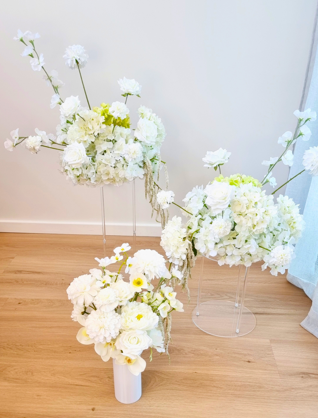 White textured faux flower bouquet with pops of yellow. Flowers in this bouquet have a range of textures & include a mix of peonies, roses, dahlias and poppies. Shown in the photos is the Bridal size bouquet. Last photo shows bridal bouquet with our matching Oslo aisle arrangements.
