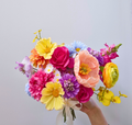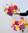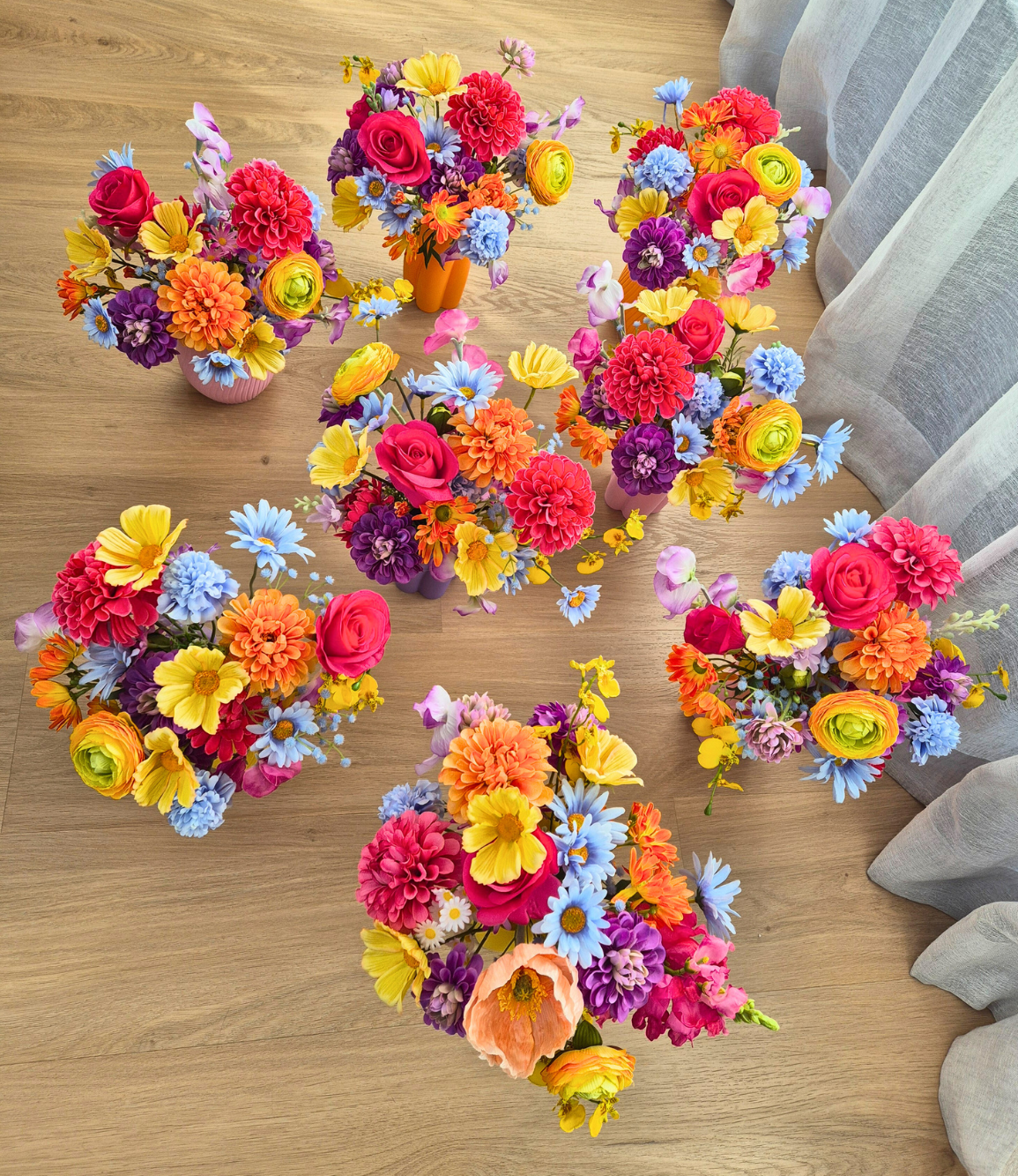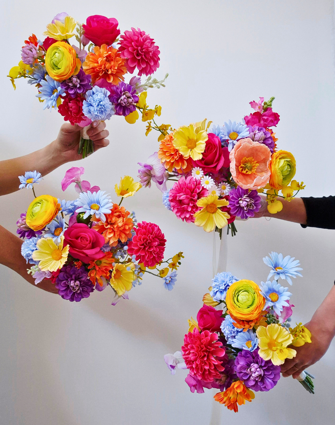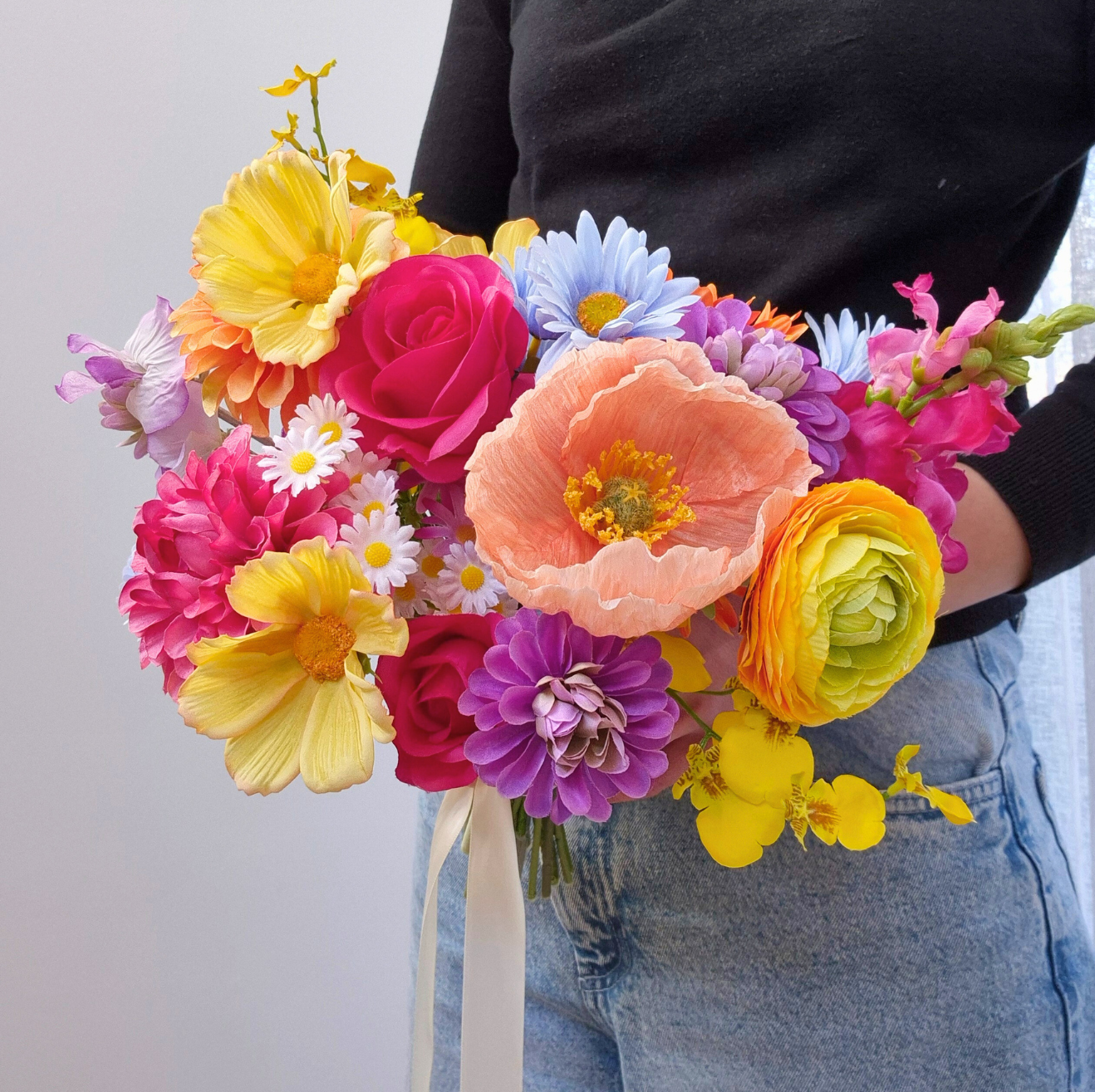 Bright colourful flower bouquet made with roses, daisies, dahlias and assorted wildflowers. Perfect for a spring or summer garden wedding. Bouquet has a happy burst of colors like yellow, orange, pink, purple, and a touch of 'something blue', these vibrant and lively colours make a bold statement. Shown in the photos are the bridal / large bouquet and bridesmaid / medium size bouquet.