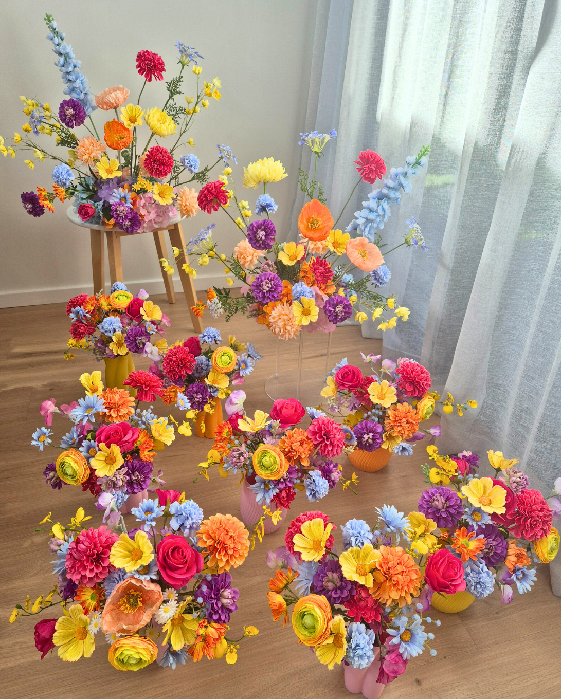 Last photo shows colorful plinth aisle arrangements to go with these bouquets: