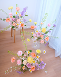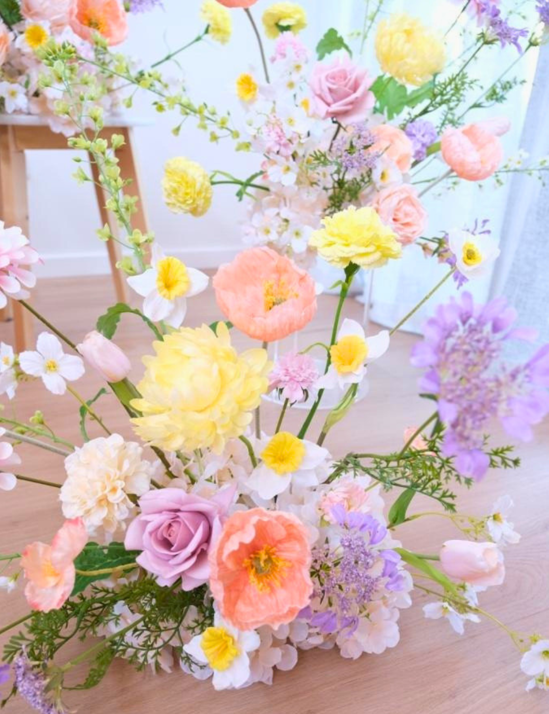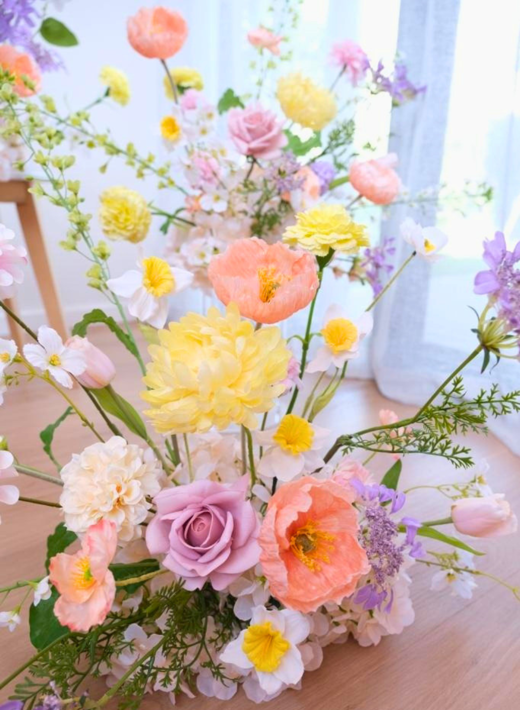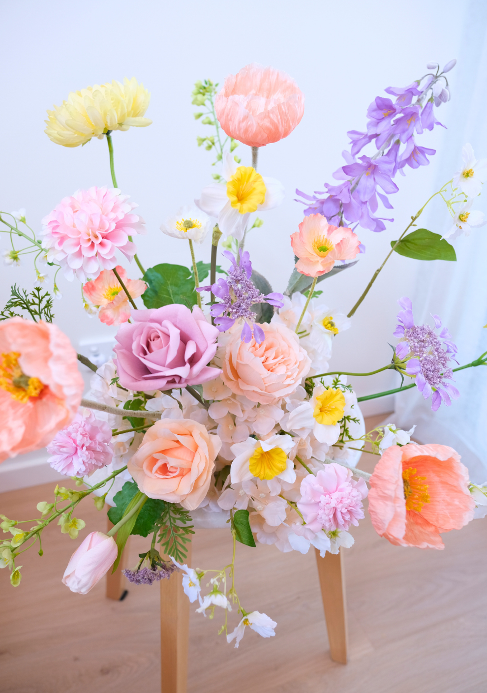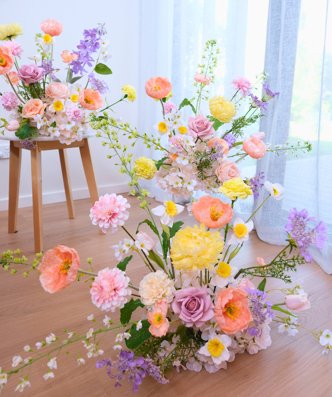 Pastel artificial silk floral arrangements (front facing / 1-sided) in shades of peach, yellow, pink and green. Spring flowers include poppies, dahlias, chrysanthemums, roses, daffodils, poppies, tulips and assorted wildflowers. Photos show deluxe size. Price is for a single piece.