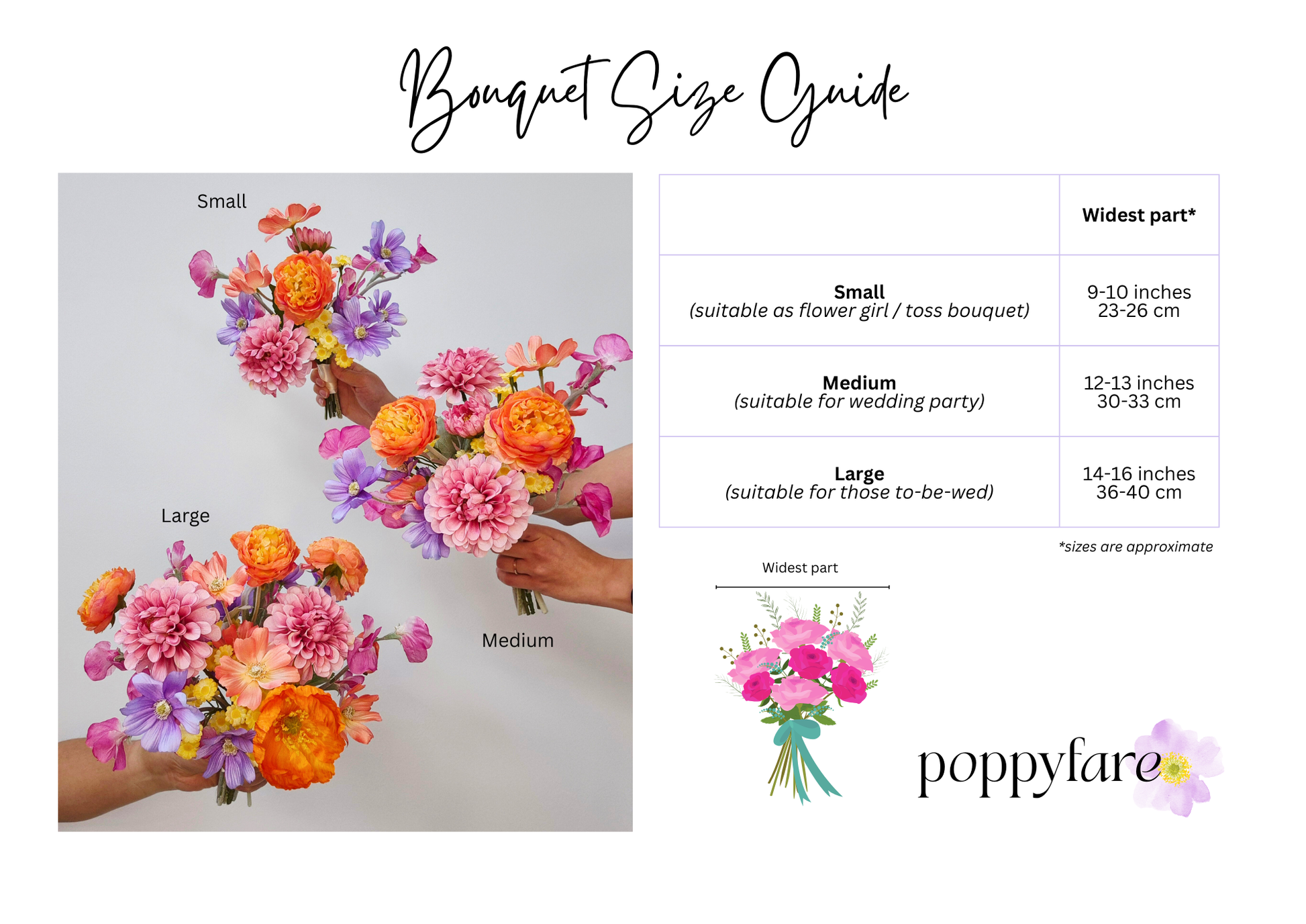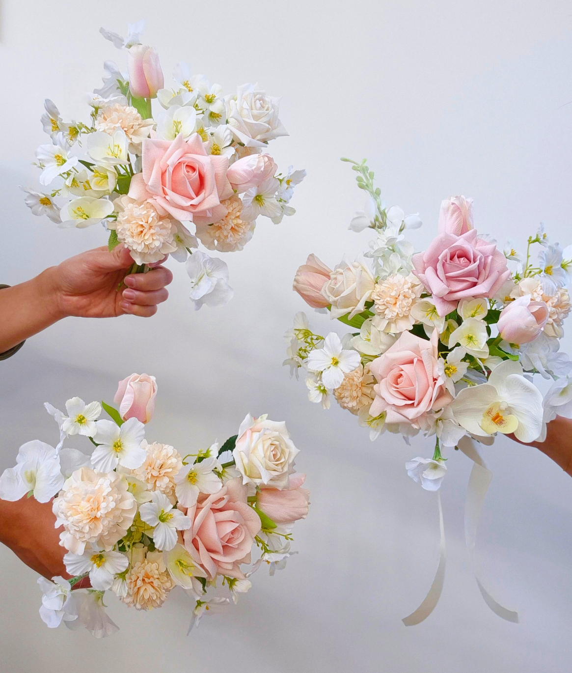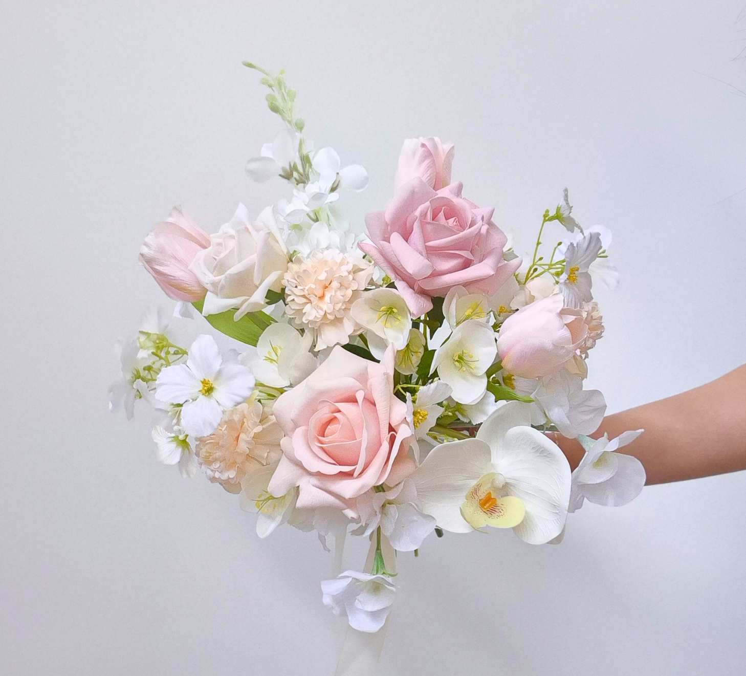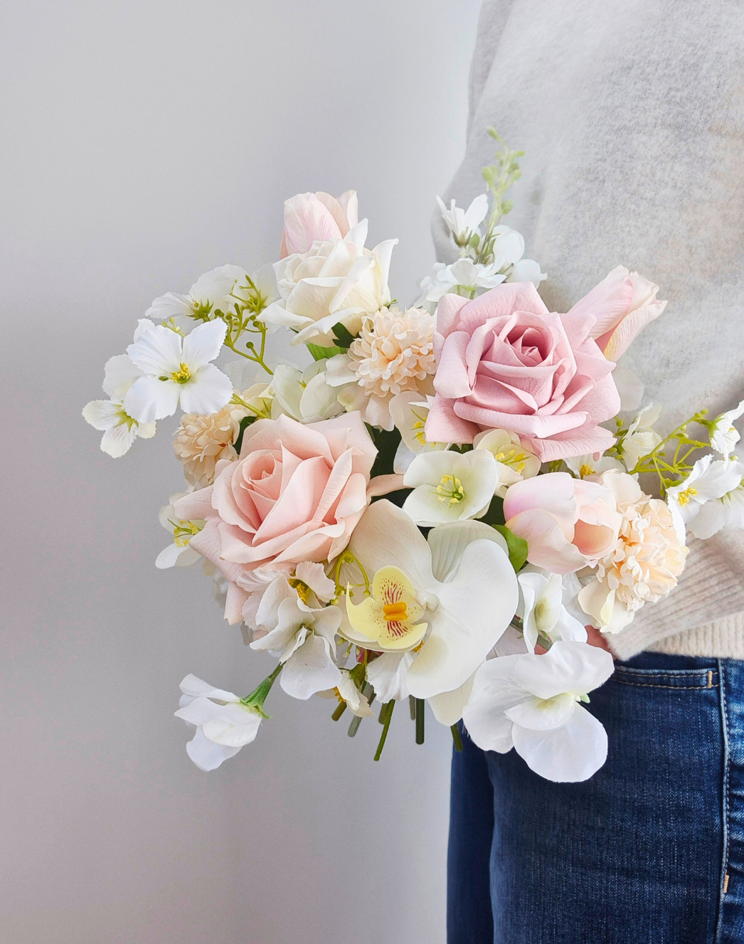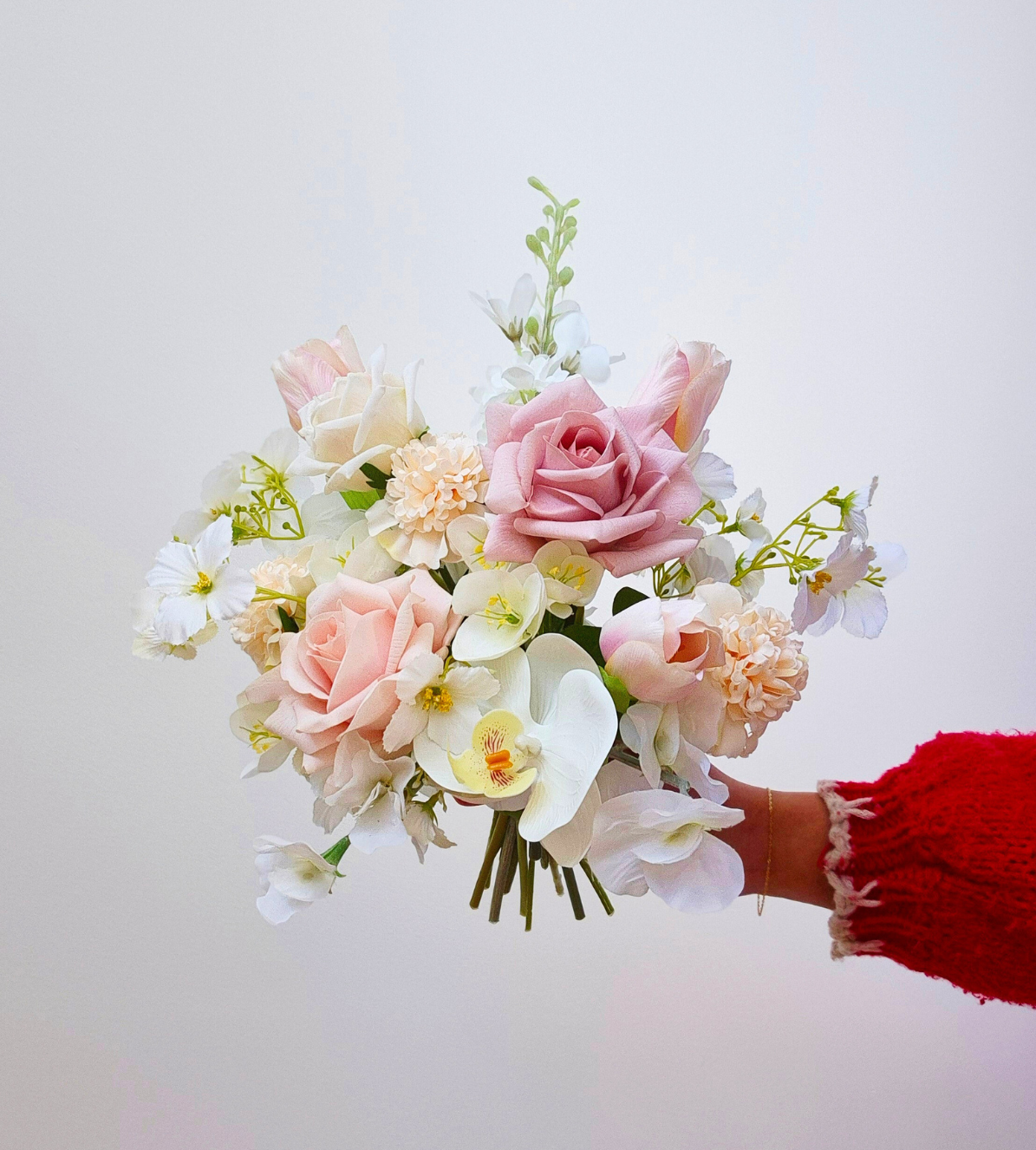 Whimsical garden style flower bouquet made with premium high-quality faux flowers (roses, tulips, orchids and wildflowers), in soft pinks & white colour. Photo shows Bridal / Large size and Medium/Bridesmaid size bouquets. NOTE - only the bridal/ large size bouquet contains orchids.