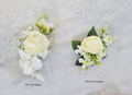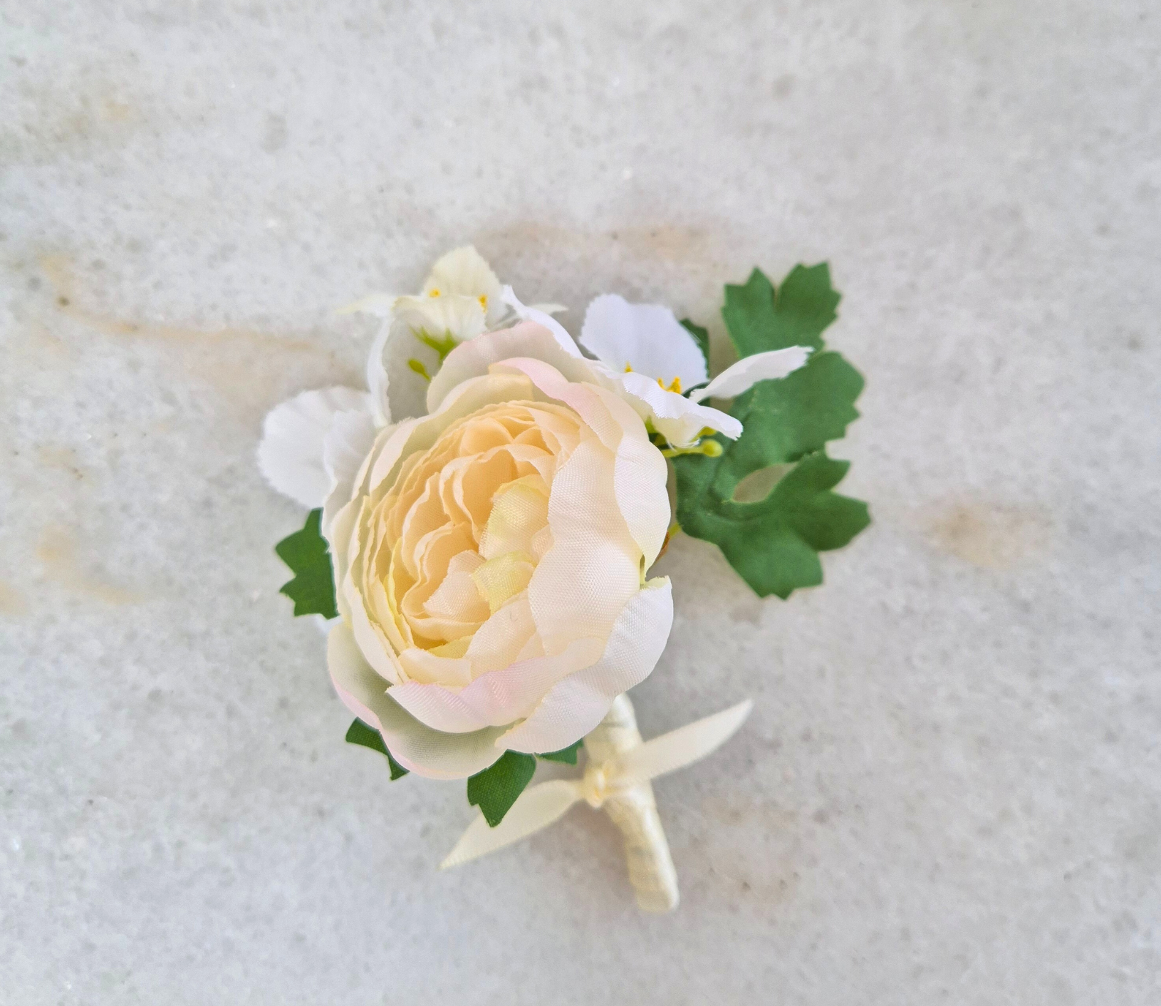 Whimsical white peach green garden wildflower bouquet. Flowers include an assortment of roses, dahlias, daisies, ranunculus and wildflowers. Photo shows bridal size bouquet and boutonniere. Bouquet and buttonhole are finished with an ivory ribbon. .
