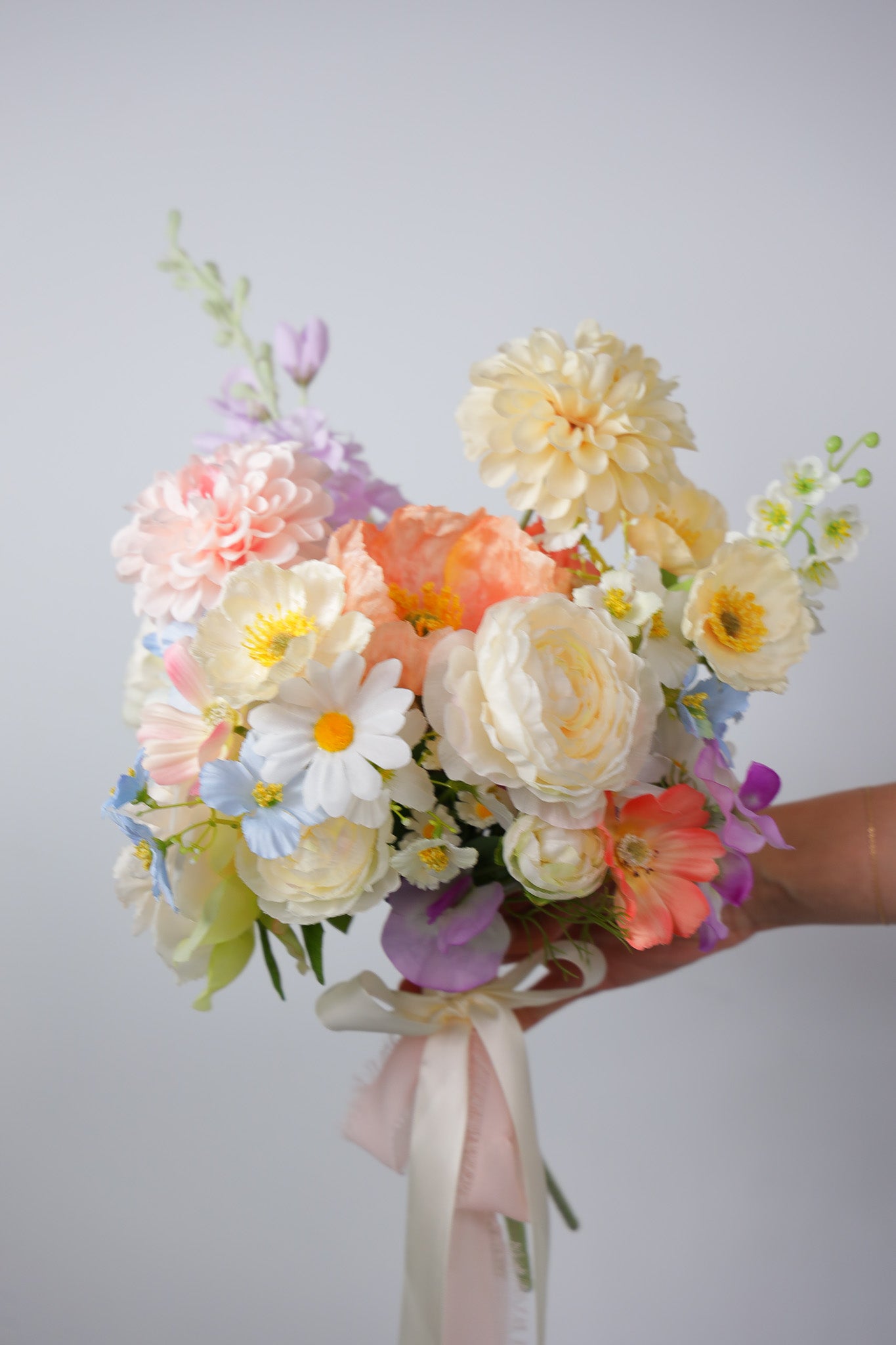 Pastel wildflower bouquet with an assortment of faux peonies, roses, dahlias, daisies, cosmos. Whimsical garden bridal bouquet in soft colours like peach, cream, lilac and pops of blue. Mix of pastel colours and different textures have been used to create this bouquet. Photos show bridal bouquet with an assortment of matching buttonholes. Bouquet is finished with a mix of ivory and blush pink ribbons. Accessories are finished with an ivory ribbon.