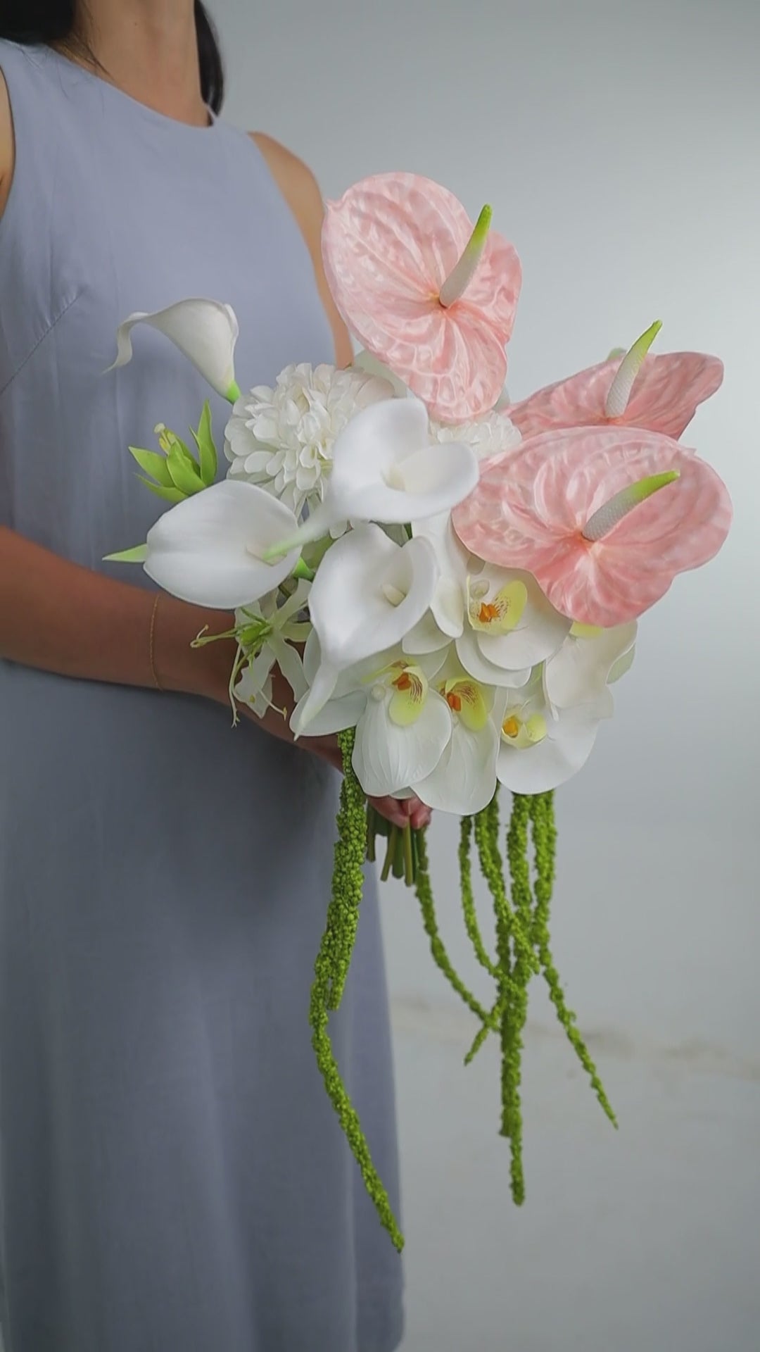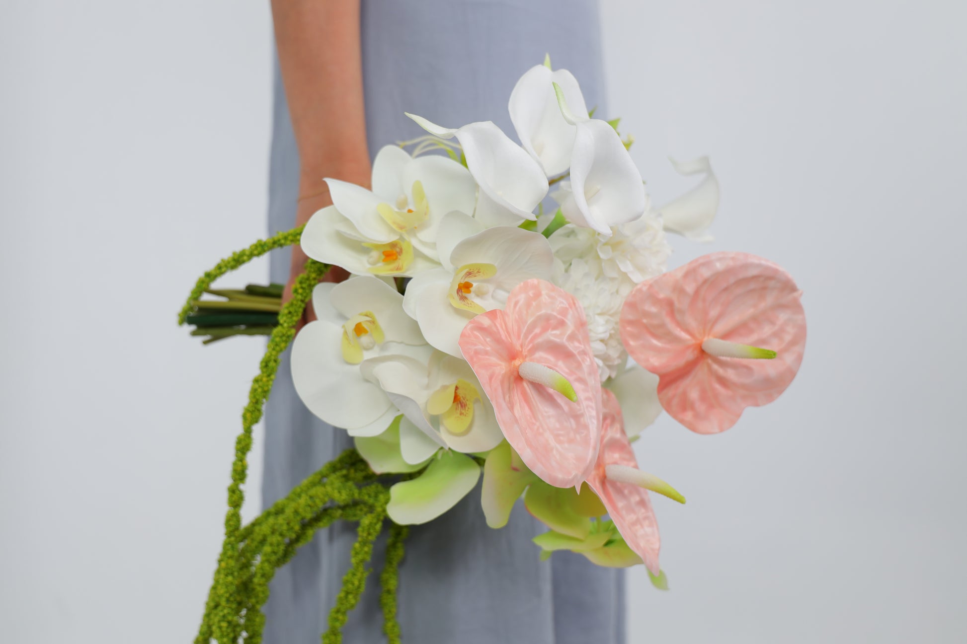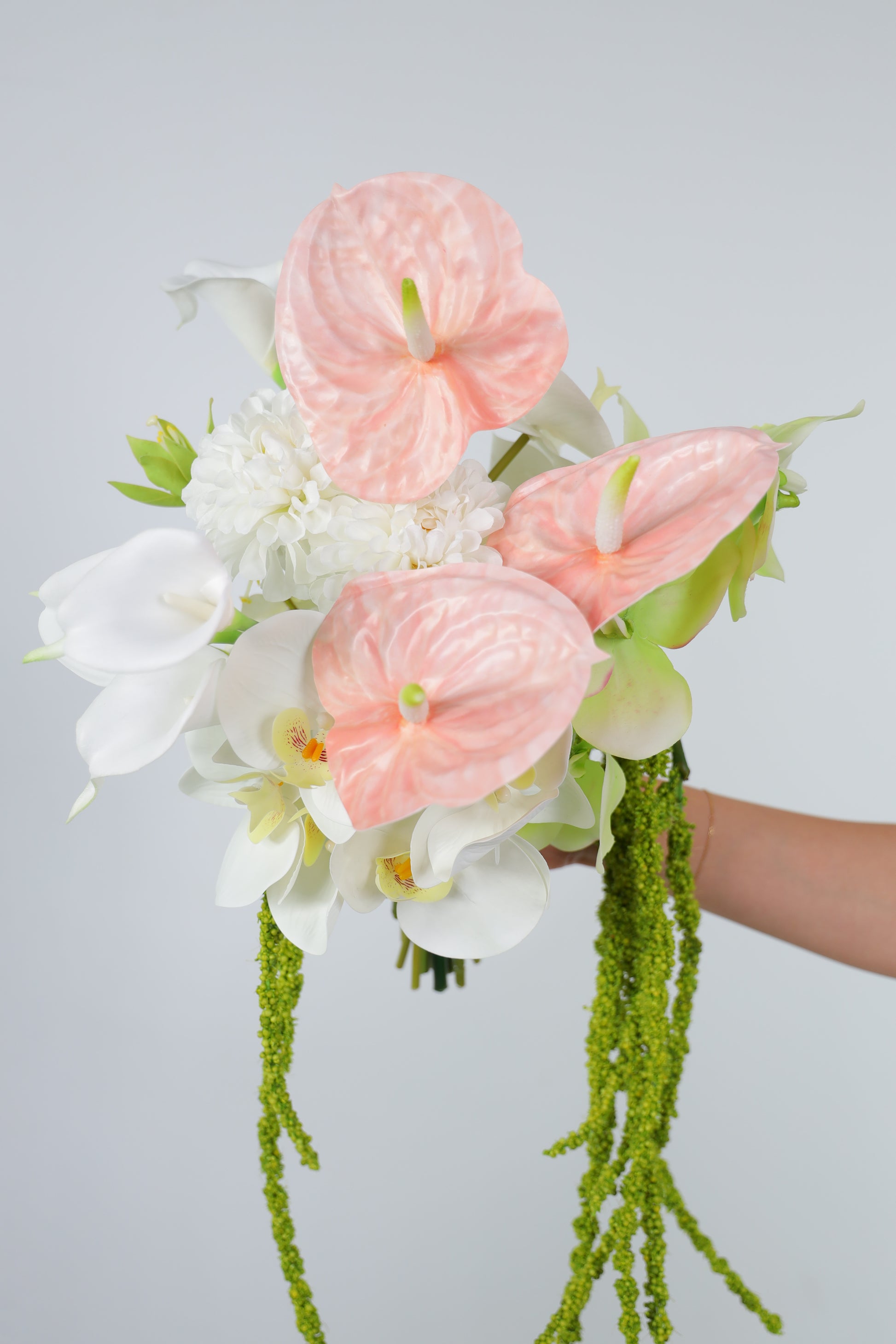 A modern sculptural bouquet crafted with a mix of real touch, silk and premium faux anthuriums, orchids, calla lilies and amaranthus in layered tones of white, green and blush pink. Designed for the bride who loves contemporary, editorial-style florals - this bouquet feels refined and architectural while still romantic and feminine. Finished with an ivory ribbon for a minimal, polished look that complements modern weddings and sleek silhouettes. This bouquet is especially suitable for modern, minimalist, gallery, city, coastal and destination weddings where you want something memorable, sculptural and effortless. Each bouquet is carefully composed to highlight the unique shapes of anthuriums, calla lilies and orchids, with considered negative space and movement. The result is a statement piece that looks beautiful on the day and becomes a lasting keepsake.