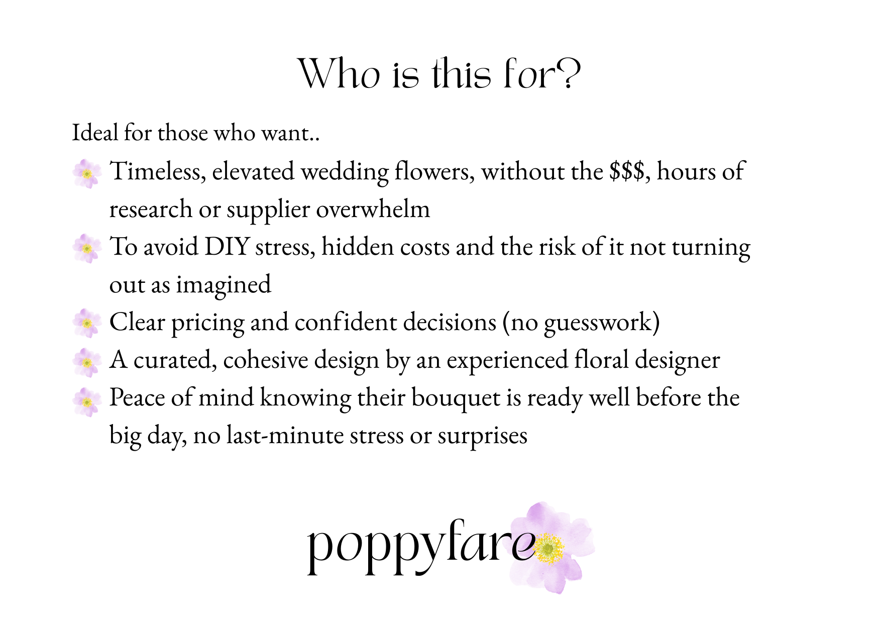 - Don’t have the time or desire to DIY, and stress about how your flowers will turn out on the morning of your wedding.
