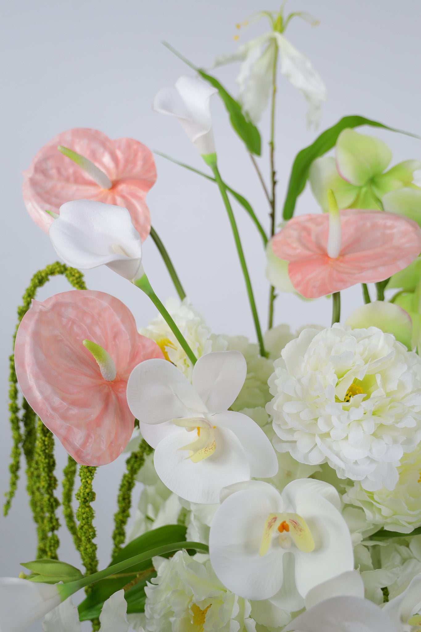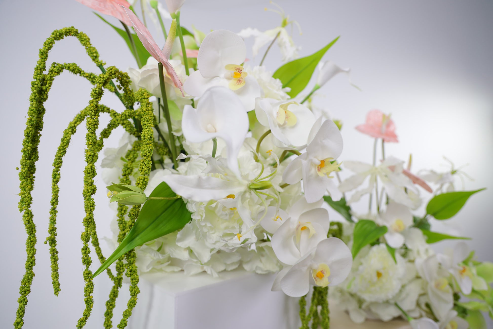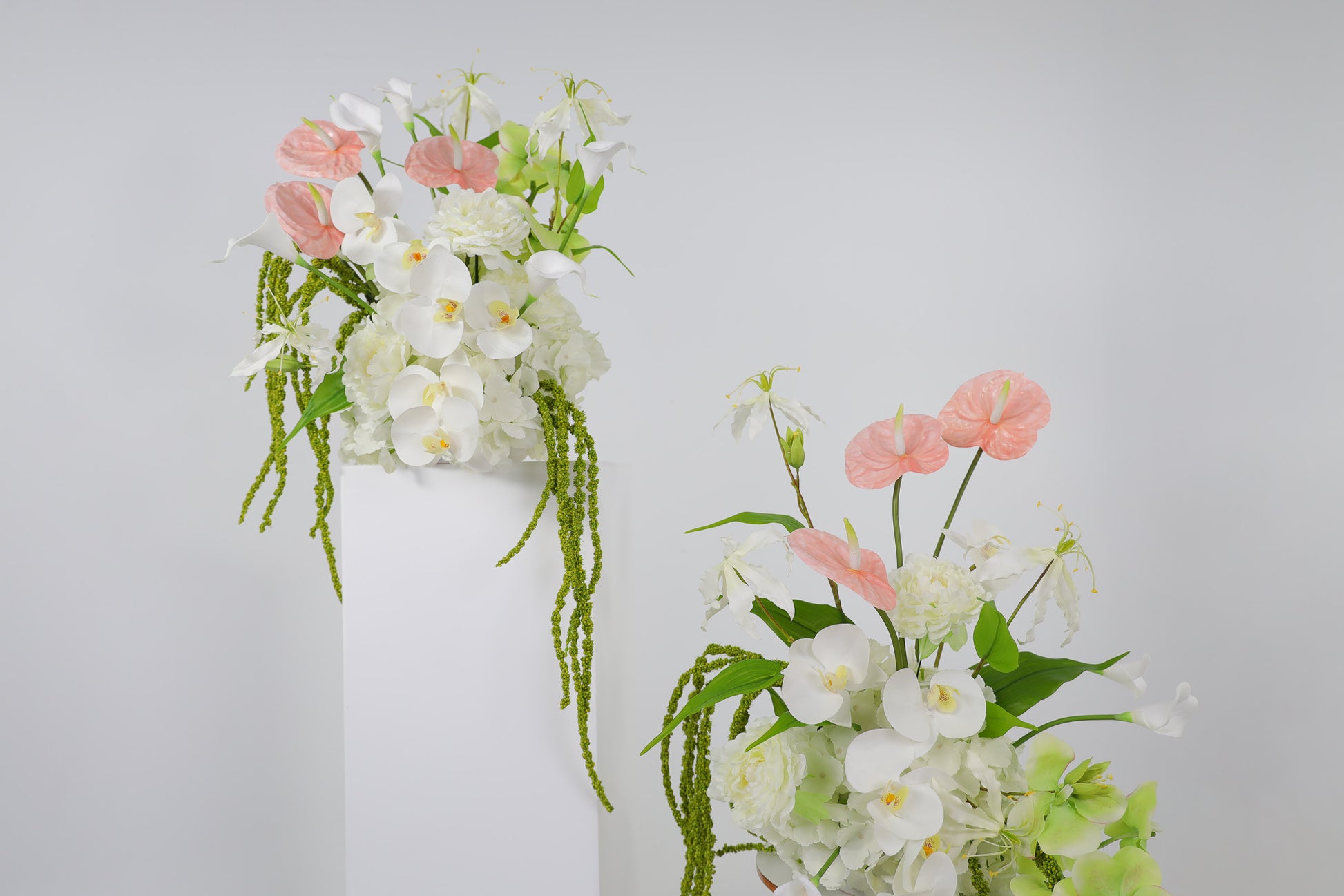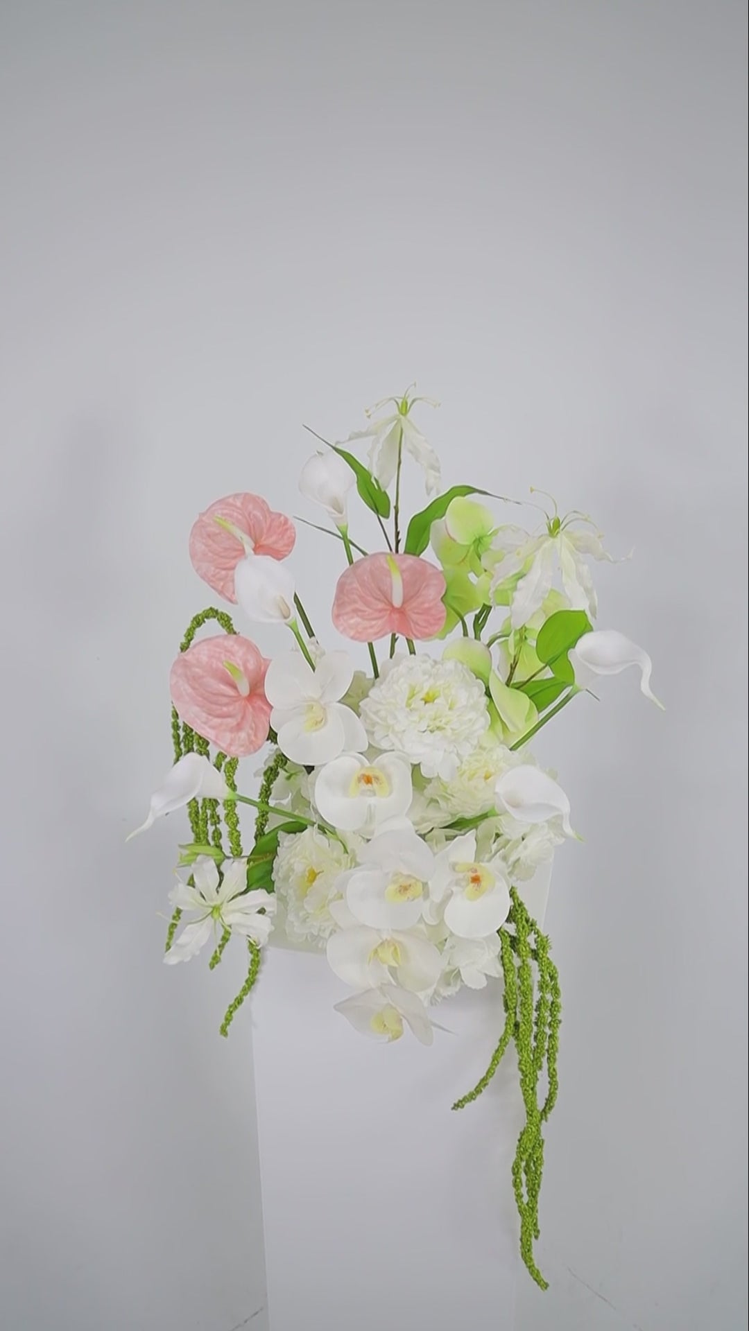 Elevate your wedding styling with this modern faux floral plinth arrangement featuring romantic white, soft pink and lush green tones. Designed for contemporary weddings, this elegant artificial flower centerpiece brings timeless beauty to your ceremony or reception décor. Expertly arranged with premium faux anthuriums, calla lilies, peonies and orchids, each bloom is styled for layered texture, realistic movement and an effortlessly natural look that photographs beautifully. Perfect as a wedding ceremony plinth arrangement, bridal table centerpiece, reception floral décor, or luxury home styling piece after the big day. Set in a sleek white ceramic bowl vase, this statement piece suits modern, romantic and elegant wedding themes. Shown in the photos is the Deluxe size. Price is for one single arrangement.