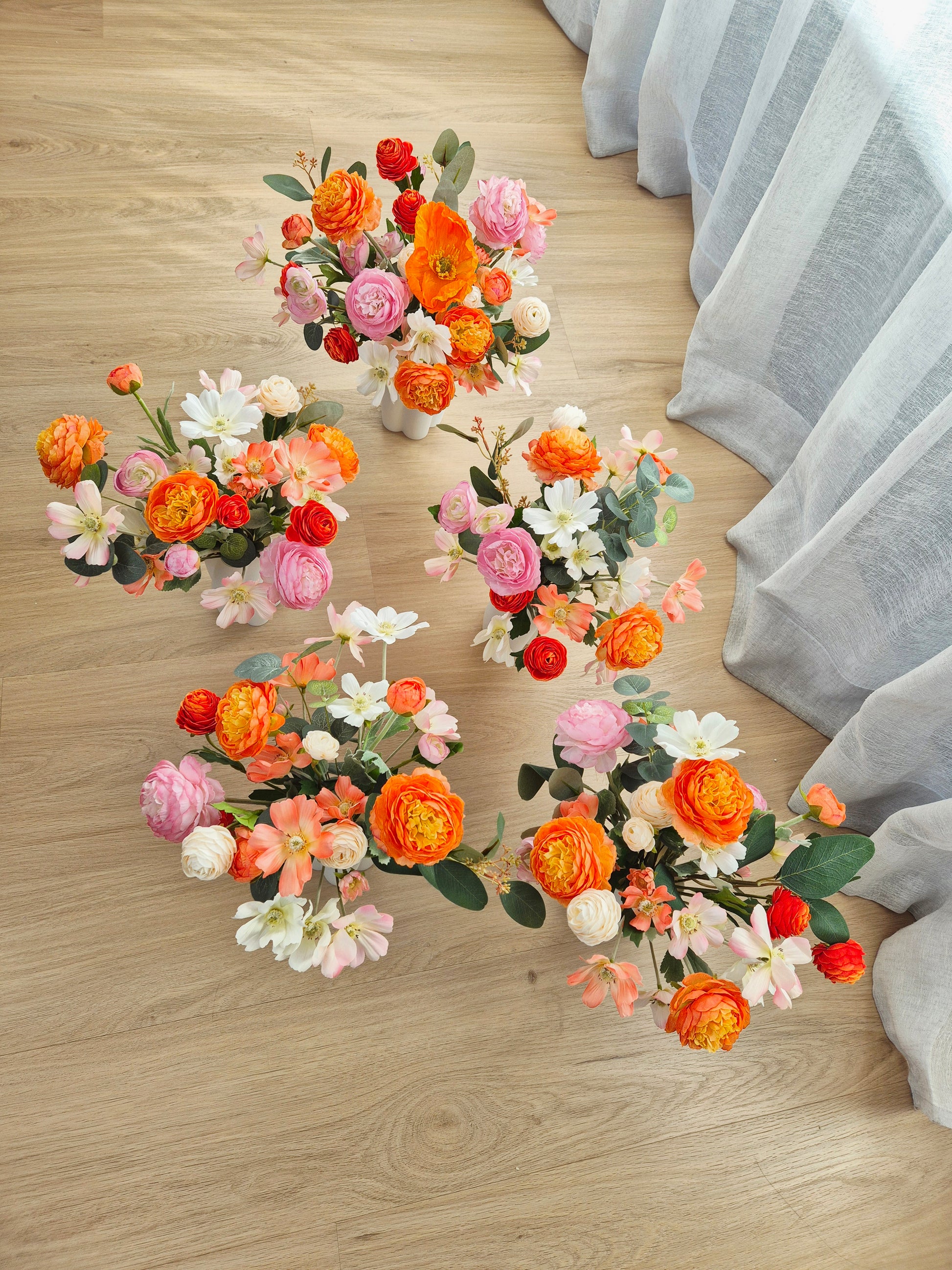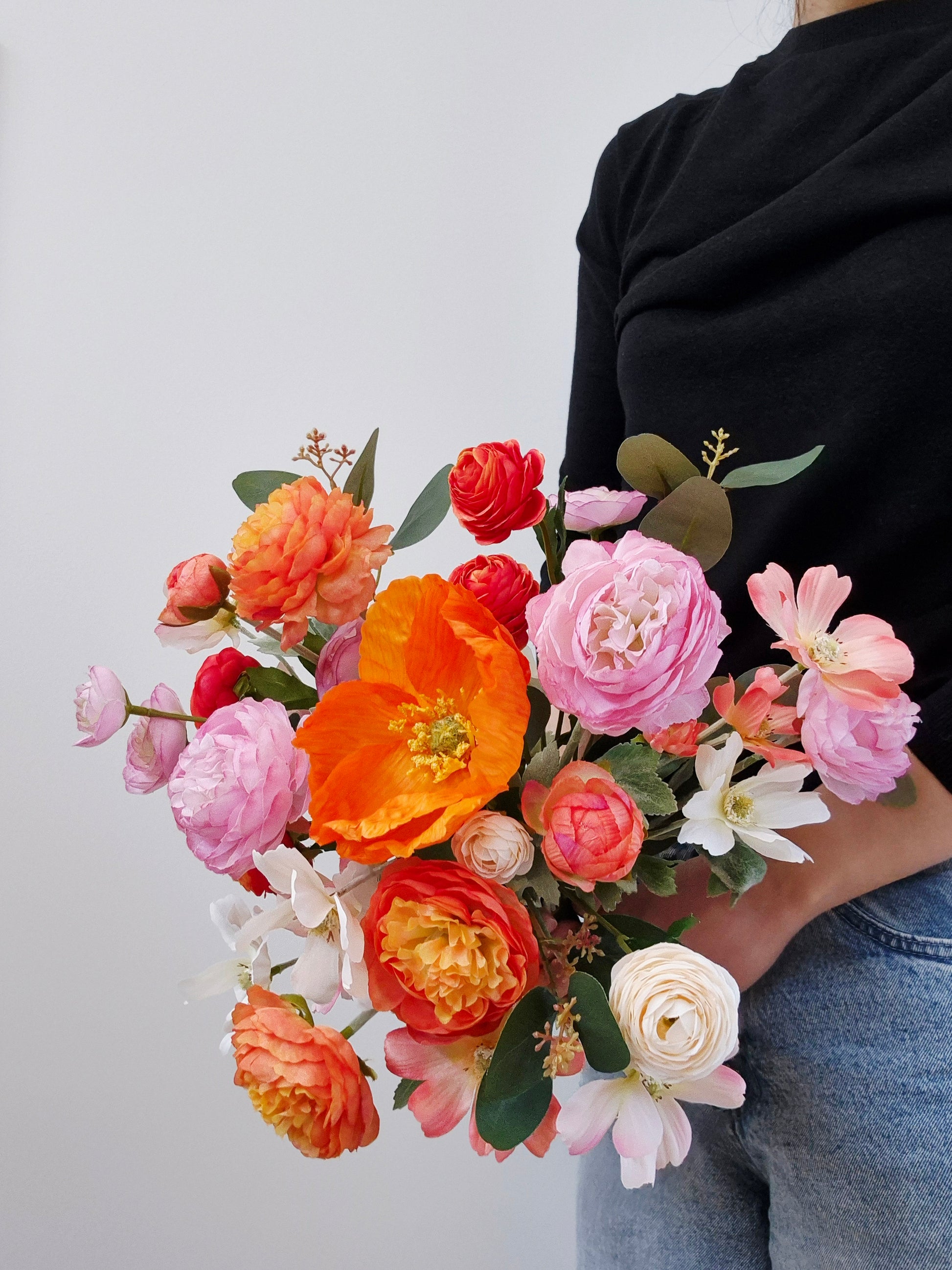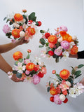 Orange, blush pink, red silk flower bouquet inspired by an Autumn garden wedding. Made with premium high-quality faux carnations, poppies, ranunculus and a touch of eucalyptus.