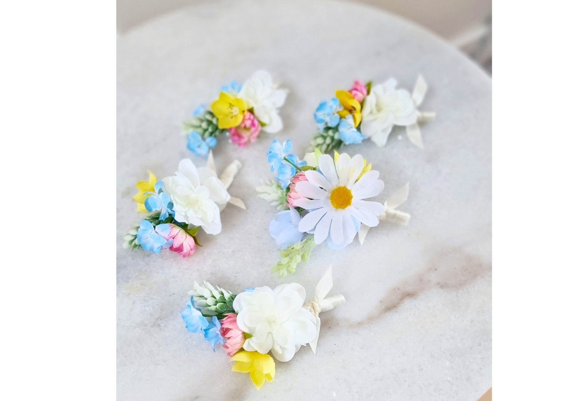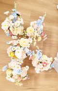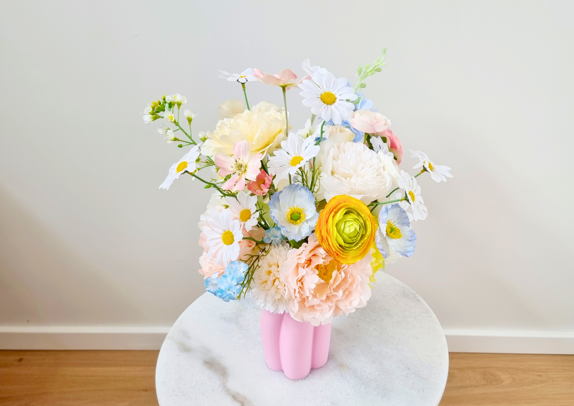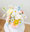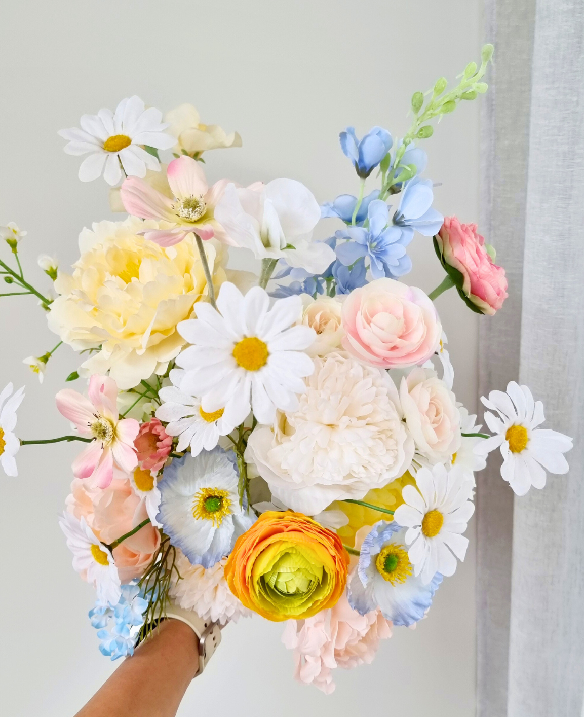 Whimsical colorful pastel wildflower bouquet with an assortment of peonies, dahlias and daisies. Flower come in pastel shades including pale pink, yellow, blue, cream, white and pops of tangerine.