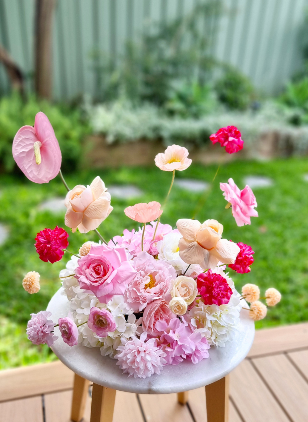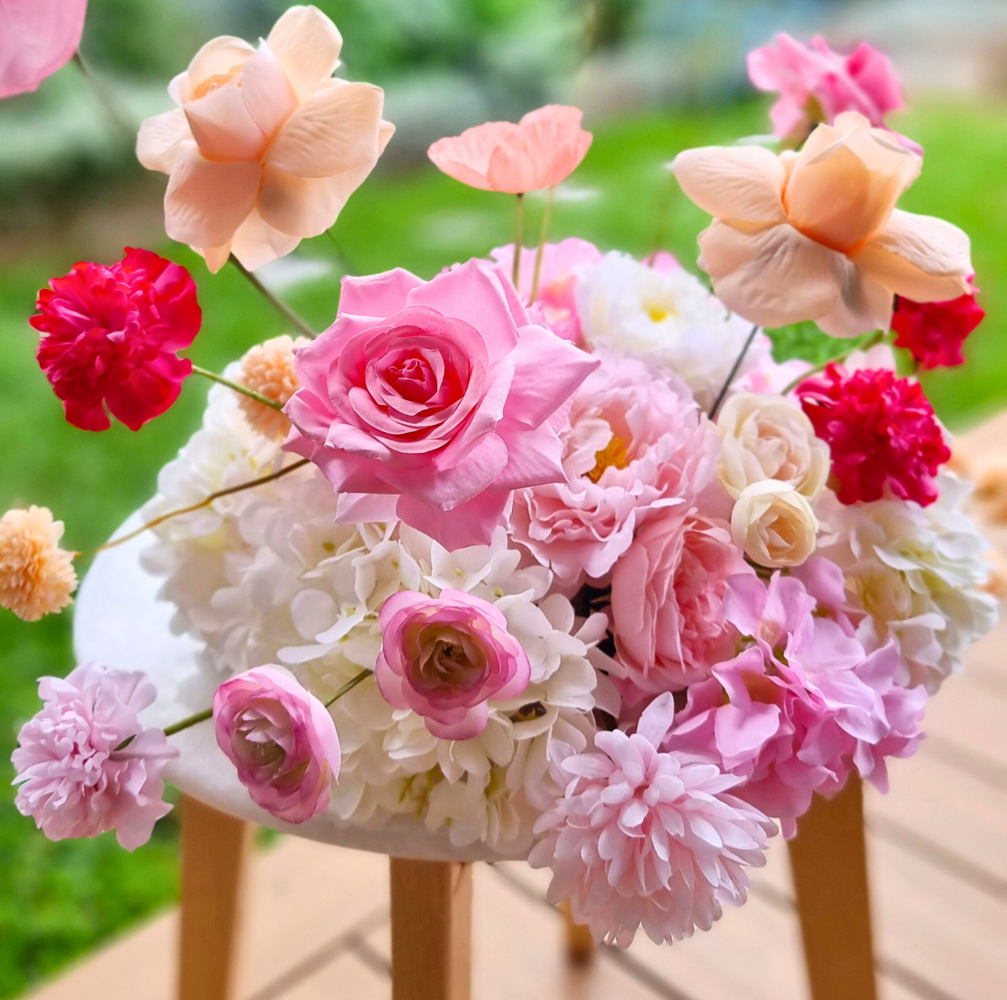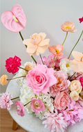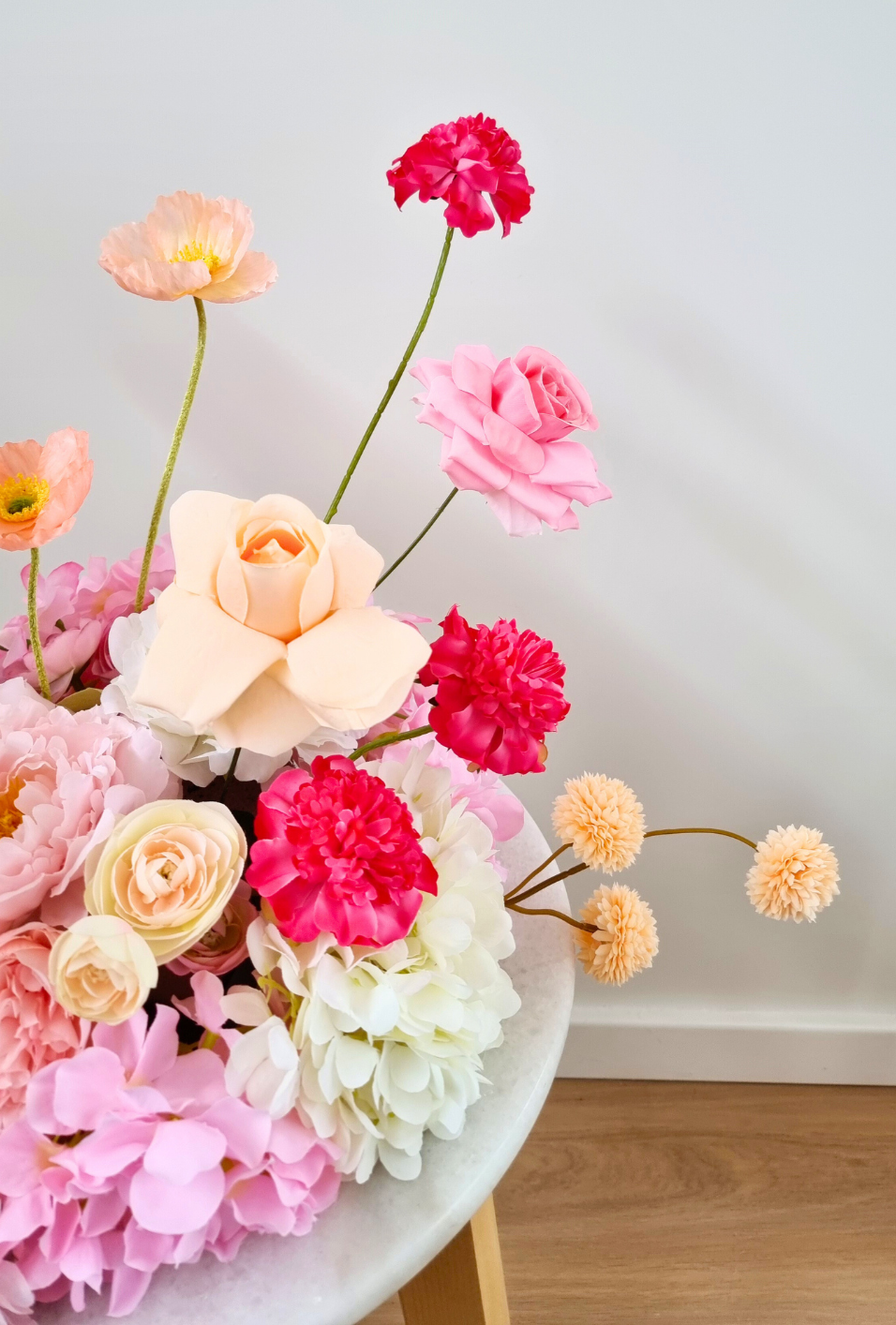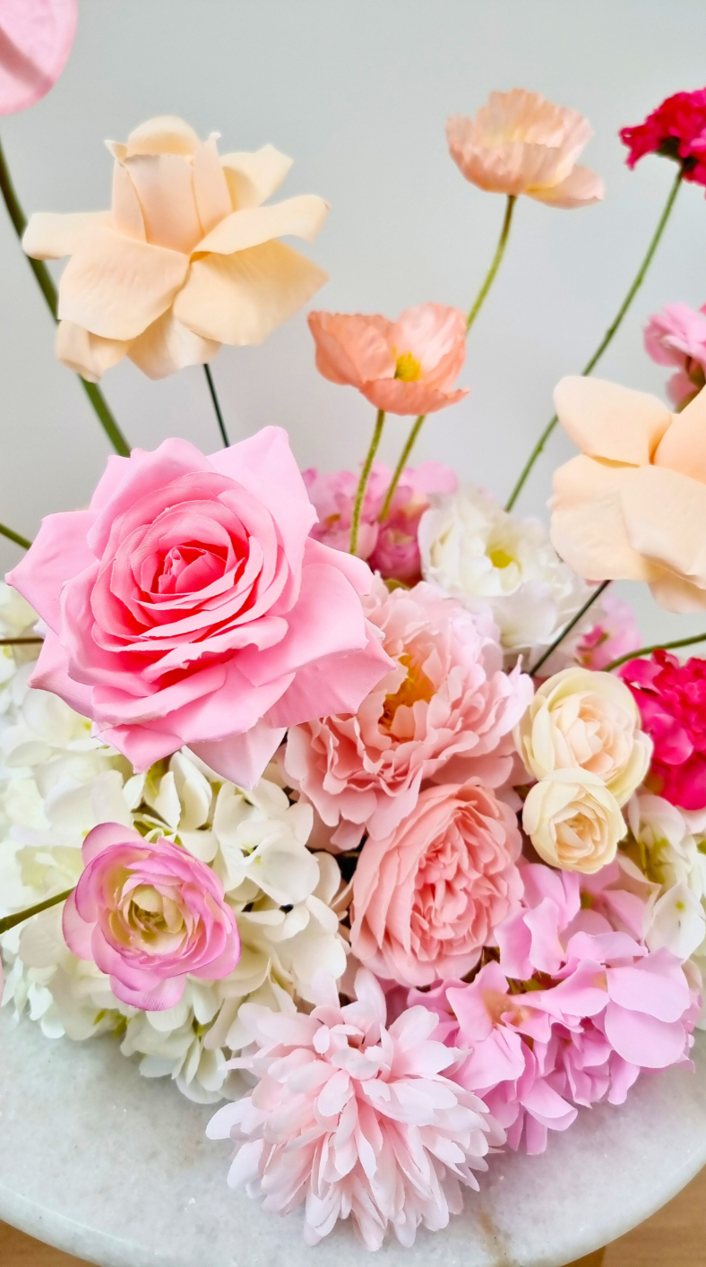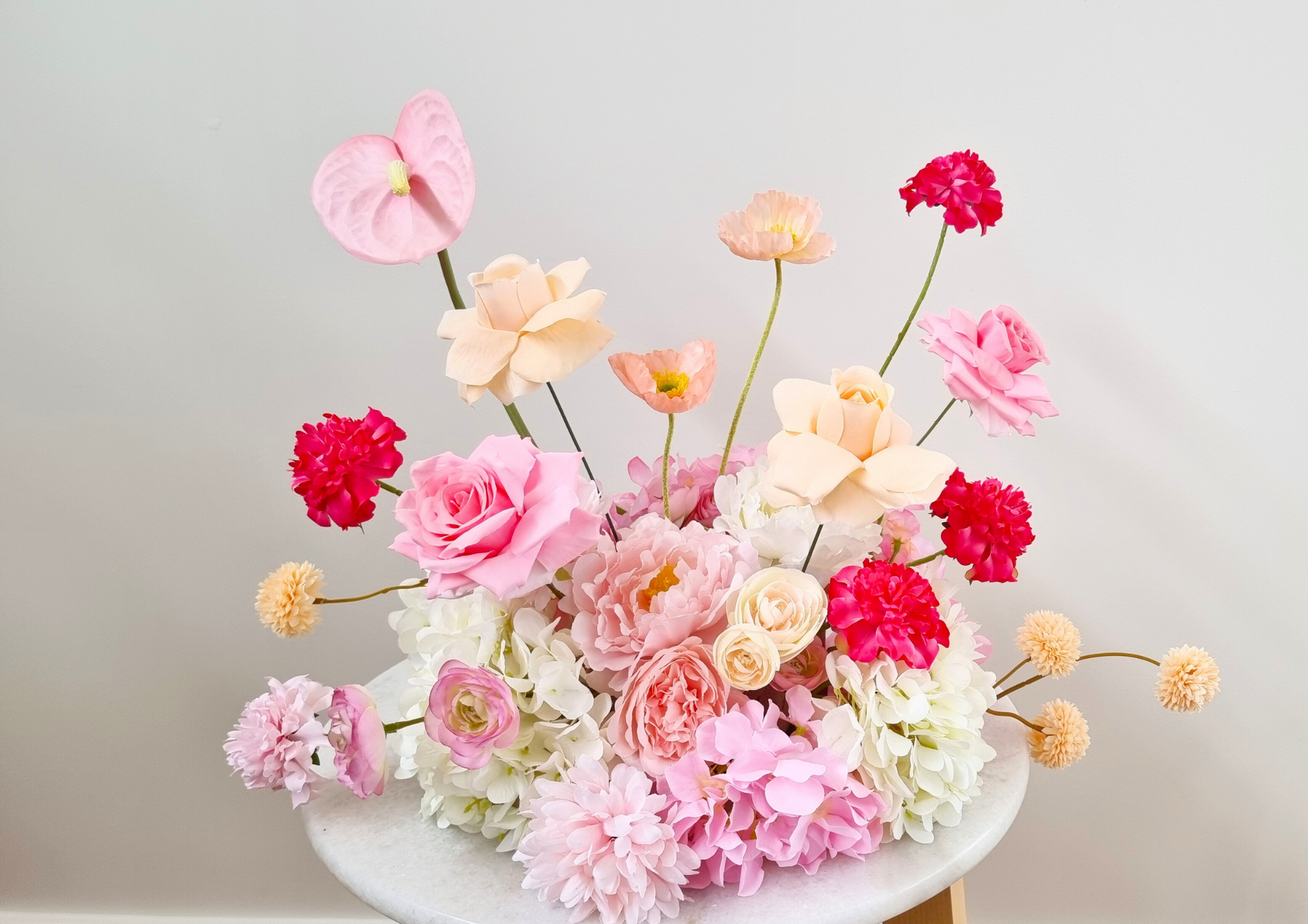 Bright pink and peach floral arrangement (front facing) made with roses, hydrangeas, anthurium and carnations. They are arranged on a foam base and suitable to be used as table, plinth or aisle flowers for weddings, events and photoshoots.
