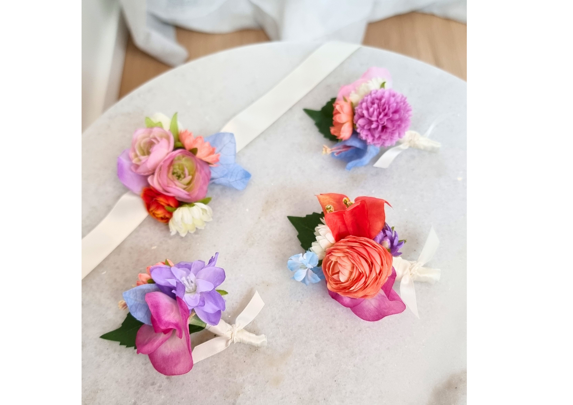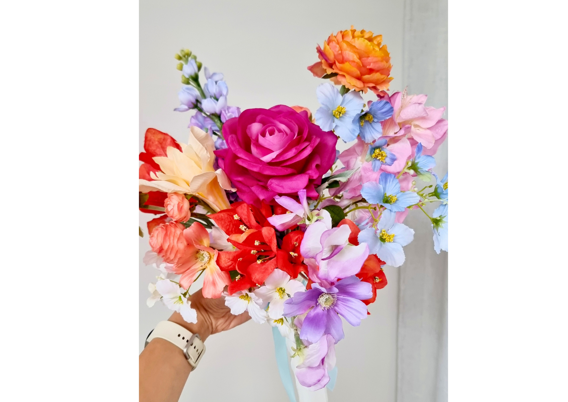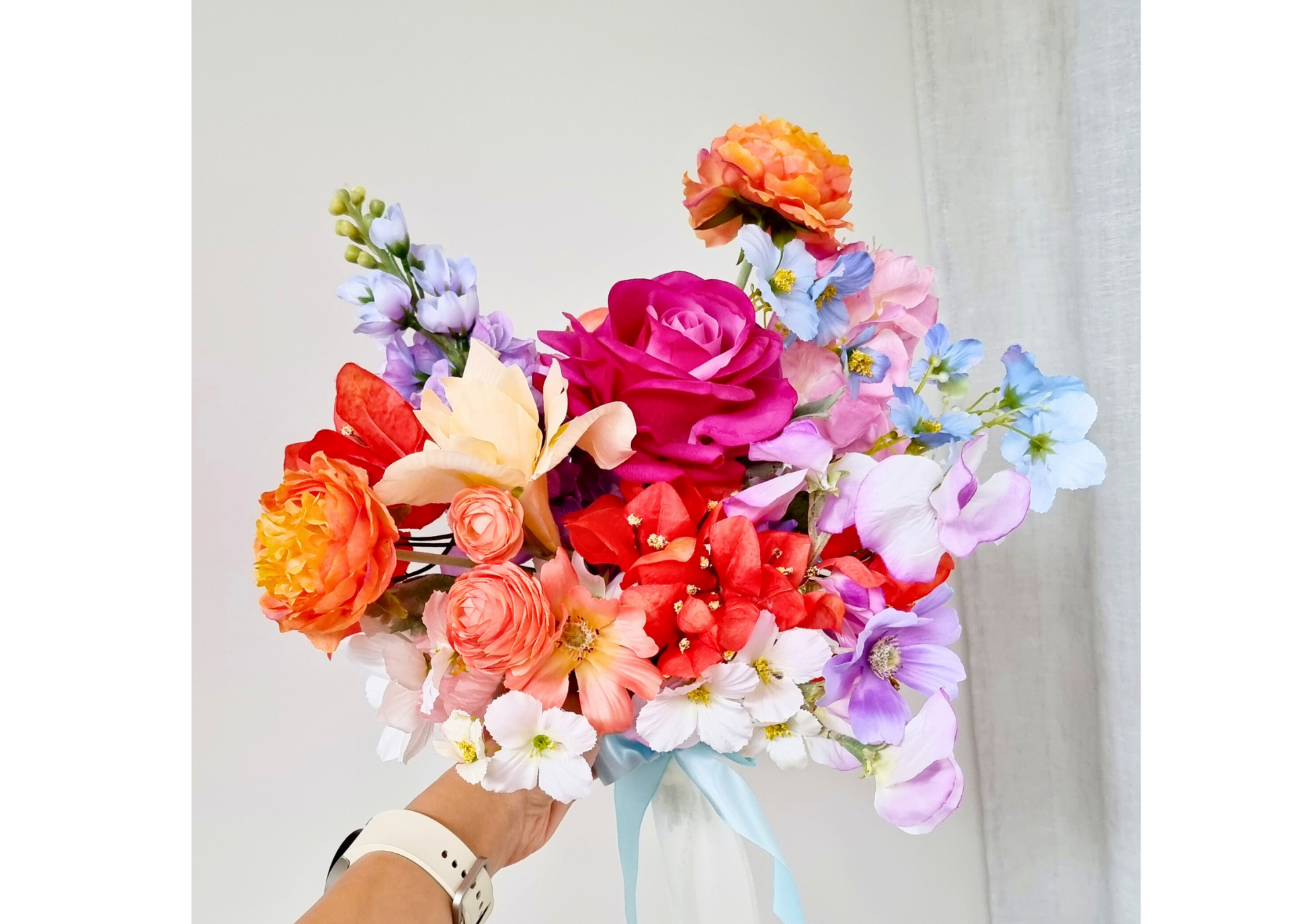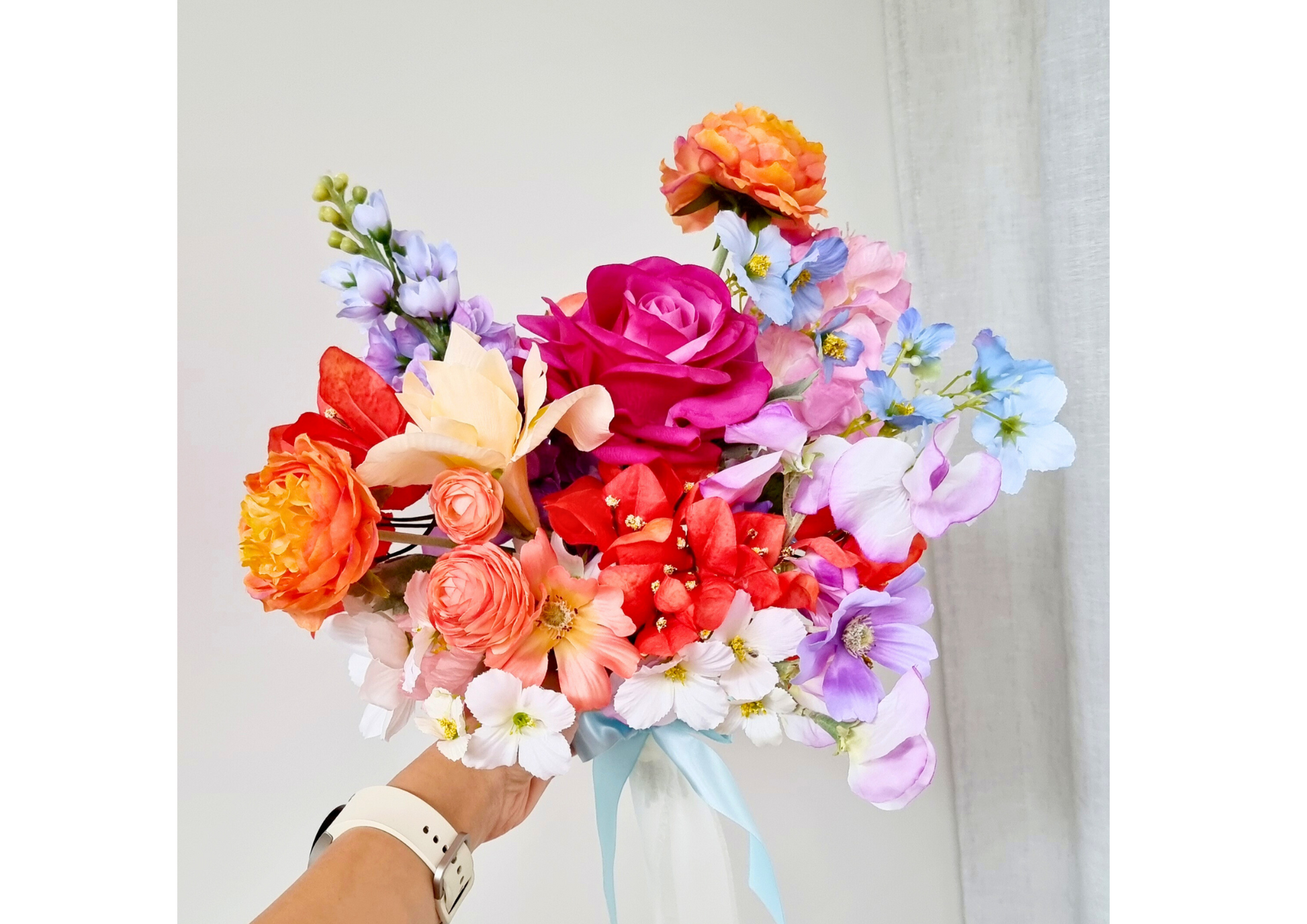 Pink orange blue colourful silk bouquet made with faux roses, bougainvillea and ranunculi in red, orange, hot pink colours with a touch of 'something blue'. Perfect for a Mediterranean inspired wedding. All bouquets, corsages and buttonholes are finished with an ivory colour ribbon.