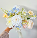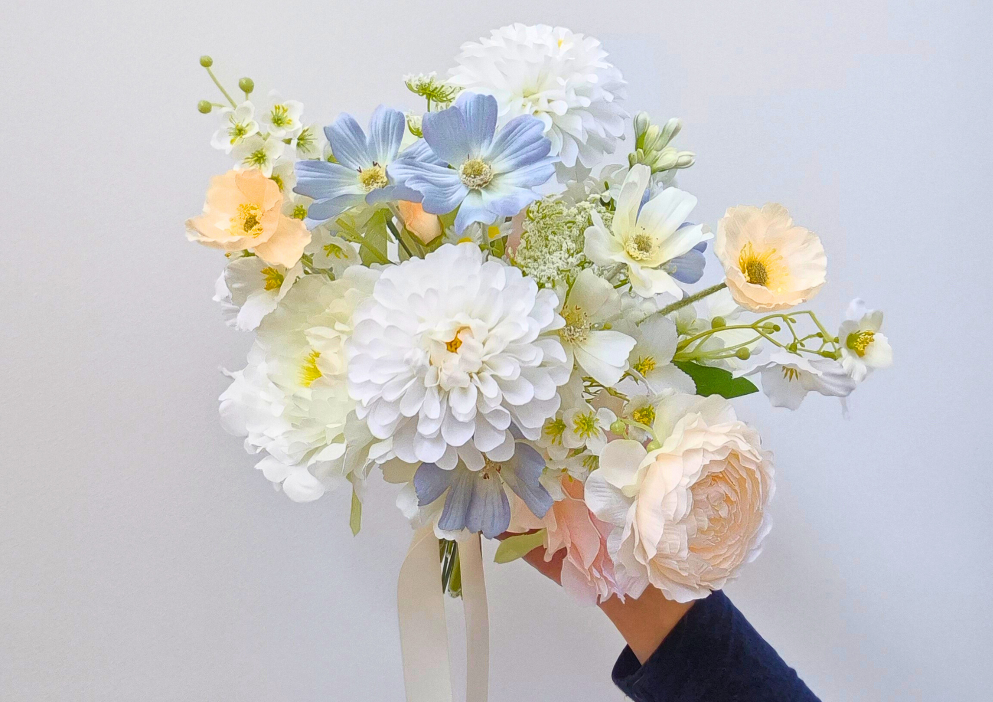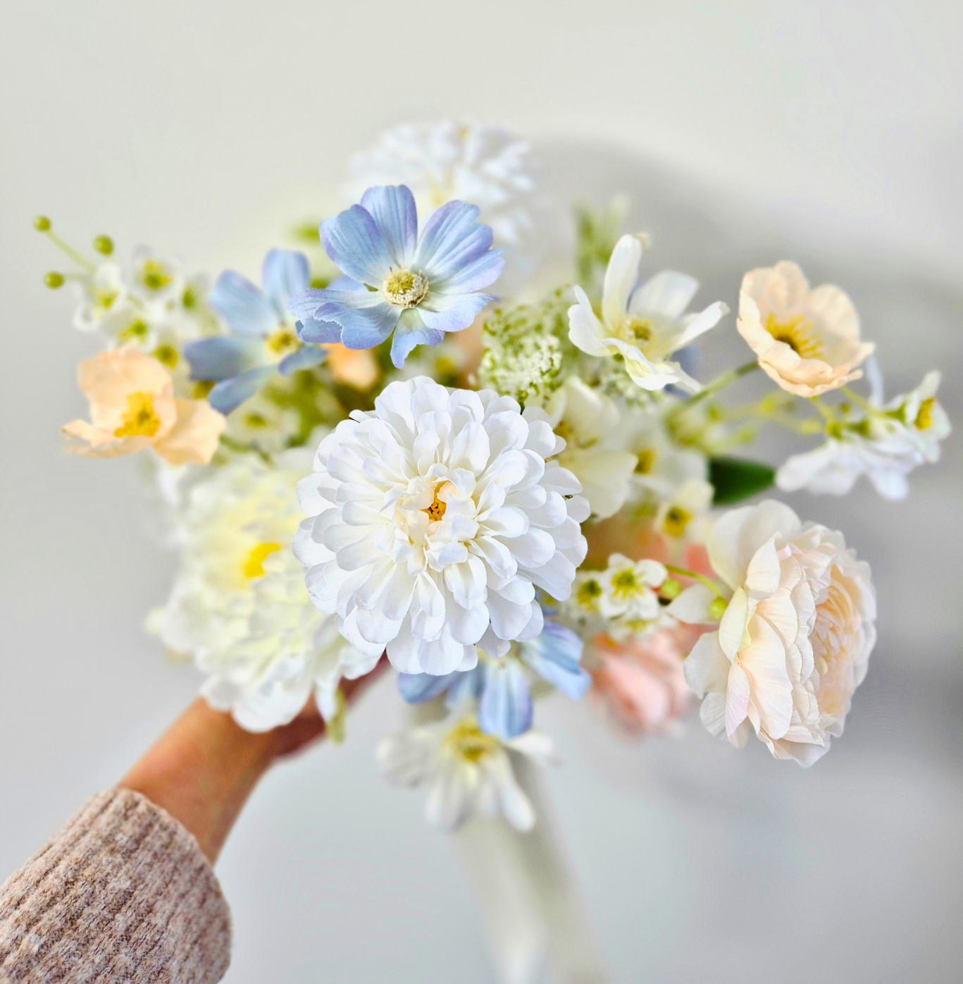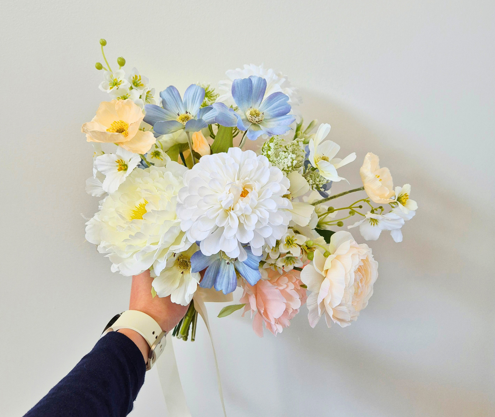 Artificial flower bouquet made with premium high-quality faux flowers (dahlias, peonies, poppies, wildflowers) in peach, white tones with pops of blue and green. Perfect for a whimsical garden wedding look. Photo shows Bridal / Large size size bouquet.