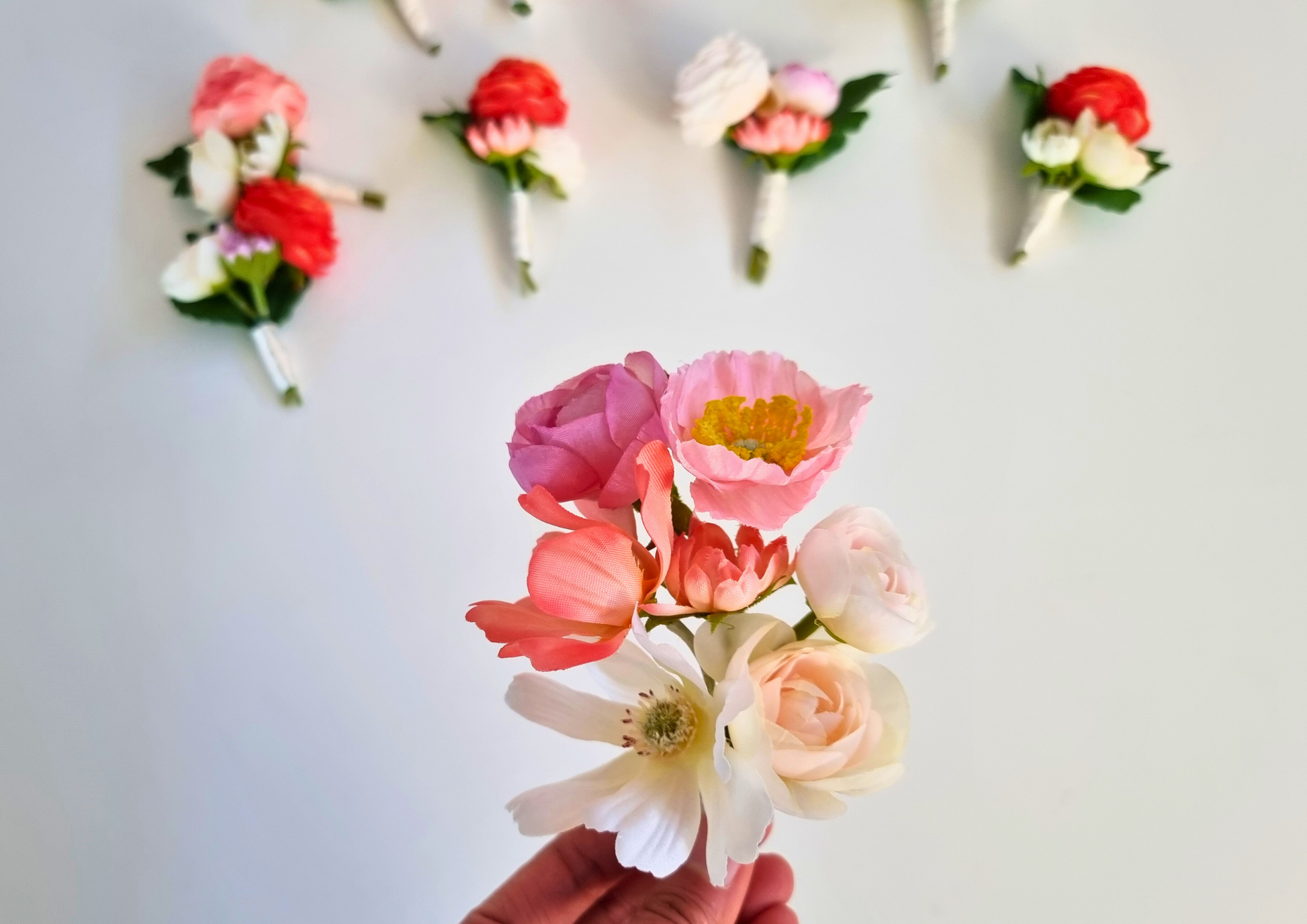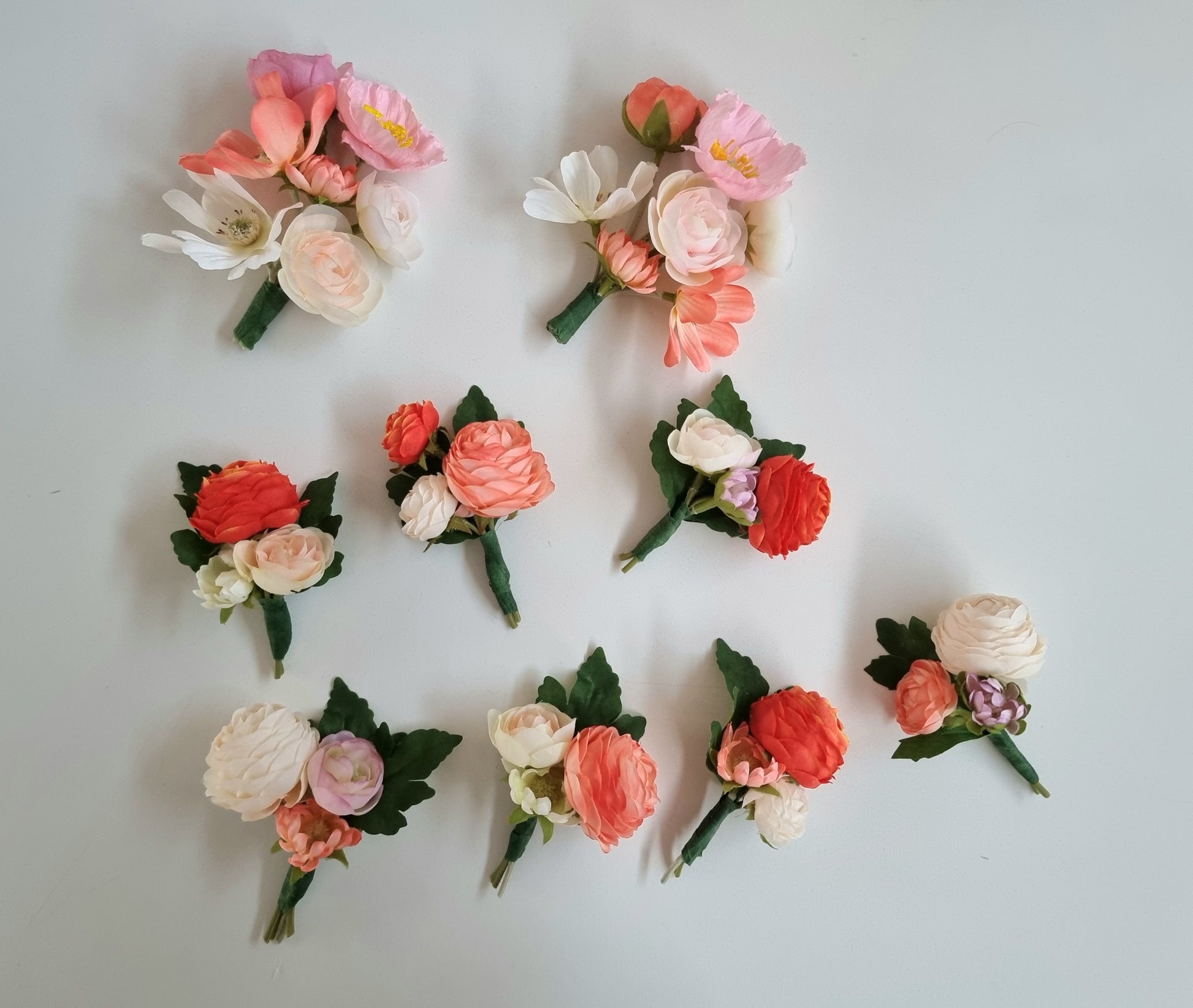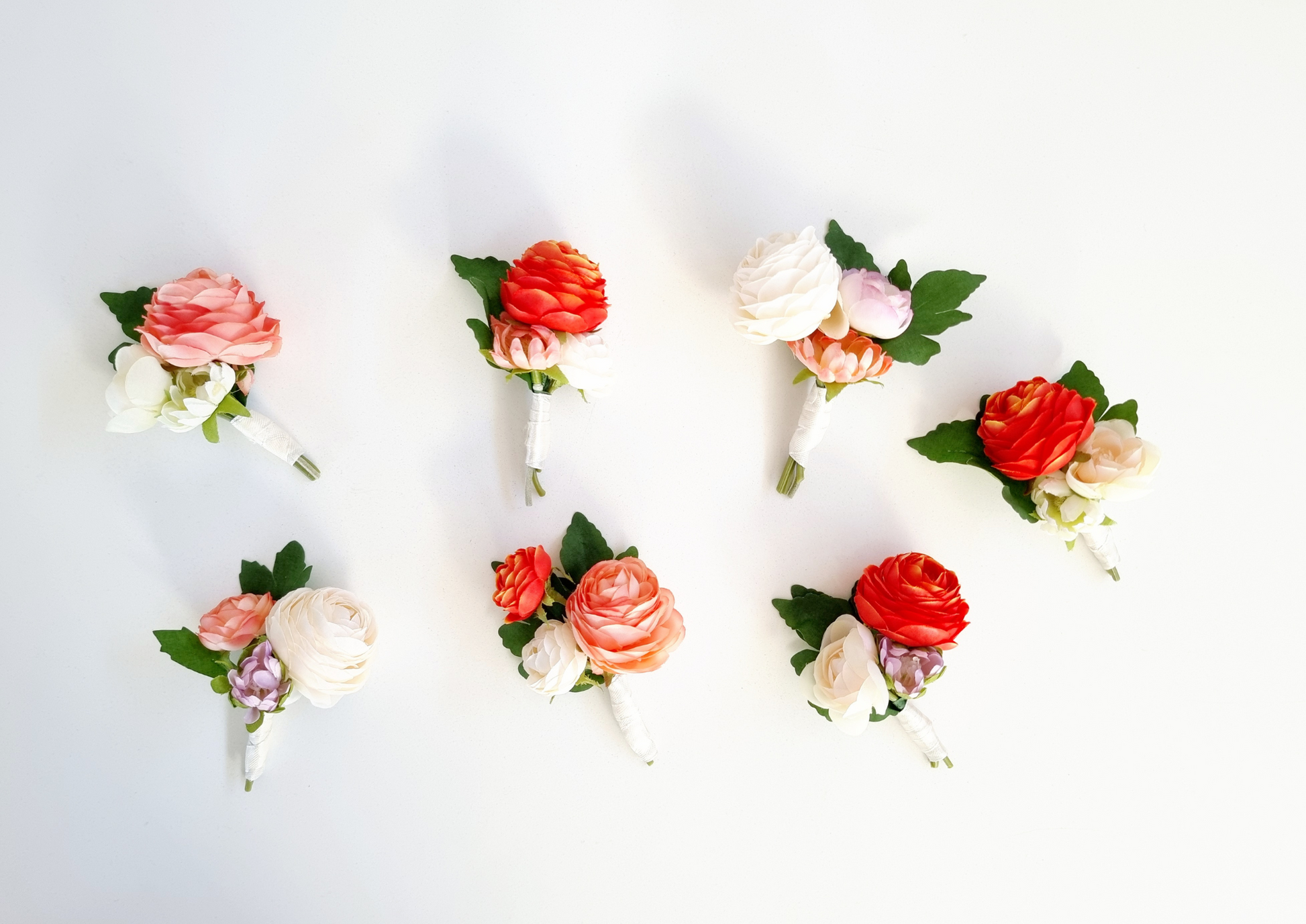 Ranunculus, poppies & roses colorful boutonnières (buttonhole, groom pin) with pops of oranges and pinks. All buttonholes and corsages come with ivory colour ribbon.