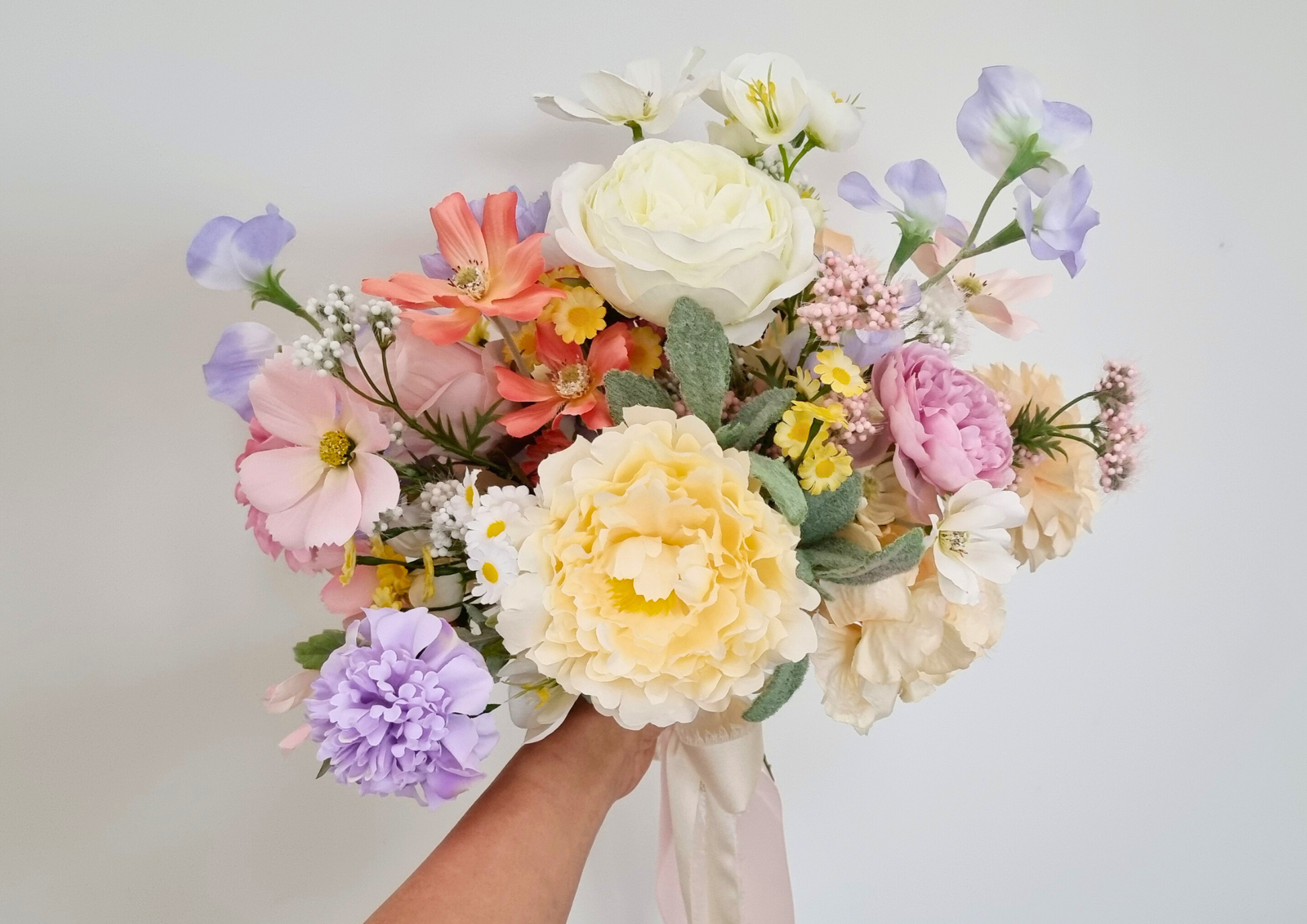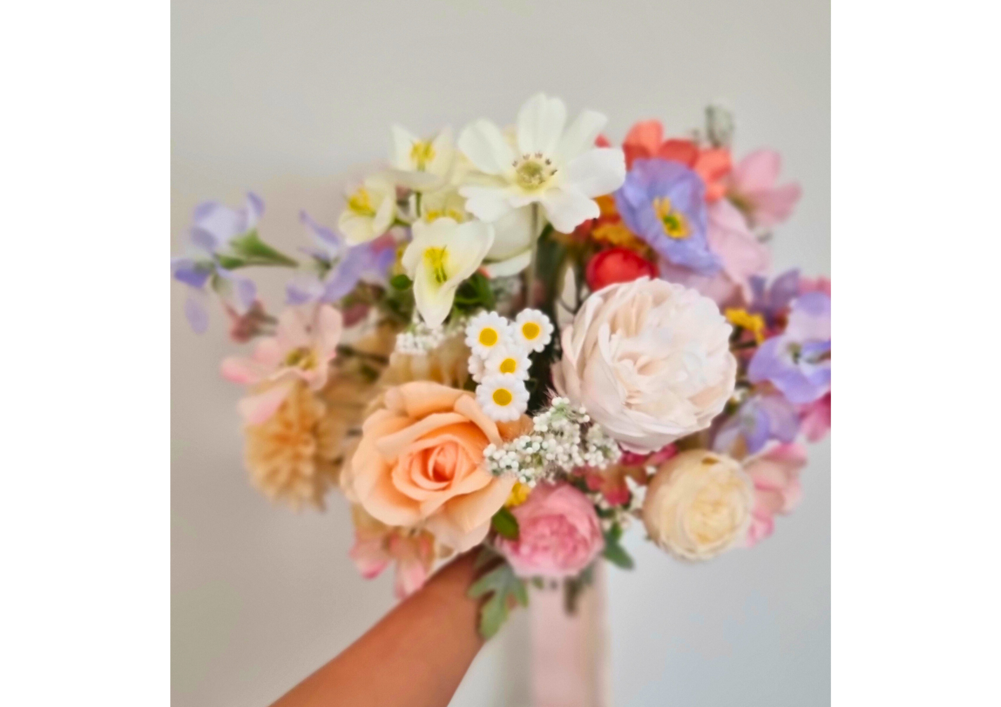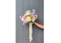 Whimsical pastel wildflower bouquet with an assortment of peonies, roses, dahlias, daisies, cosmos and greenery. Mix of pastel colours and different textures have been used to create this bouquet.