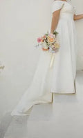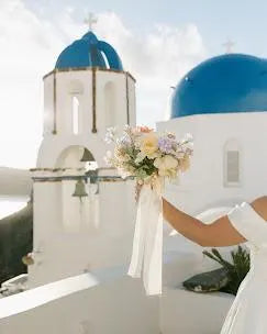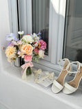 Whimsical pastel wildflower bouquet with an assortment of peonies, roses, dahlias, daisies, cosmos and greenery. Mix of pastel colours and different textures have been used to create this bouquet. Photos show bridal bouquet with matching buttonhole. Bouquet is finished with a mix of ivory and blush pink ribbons.