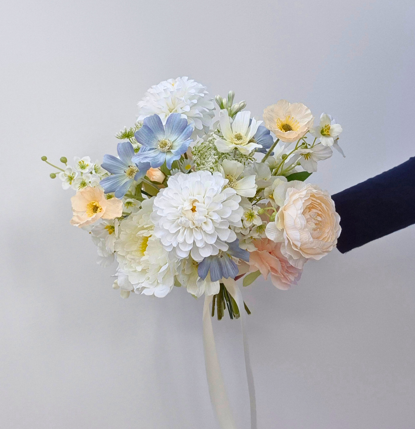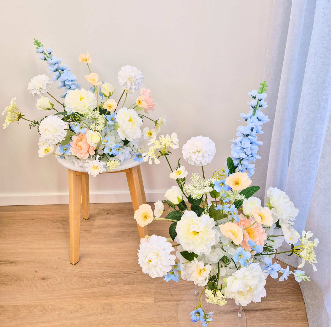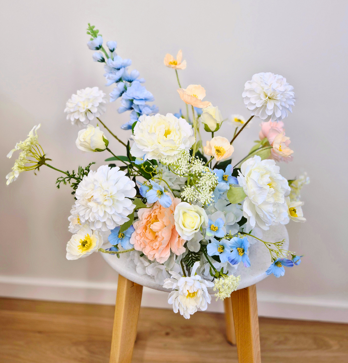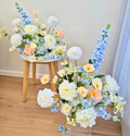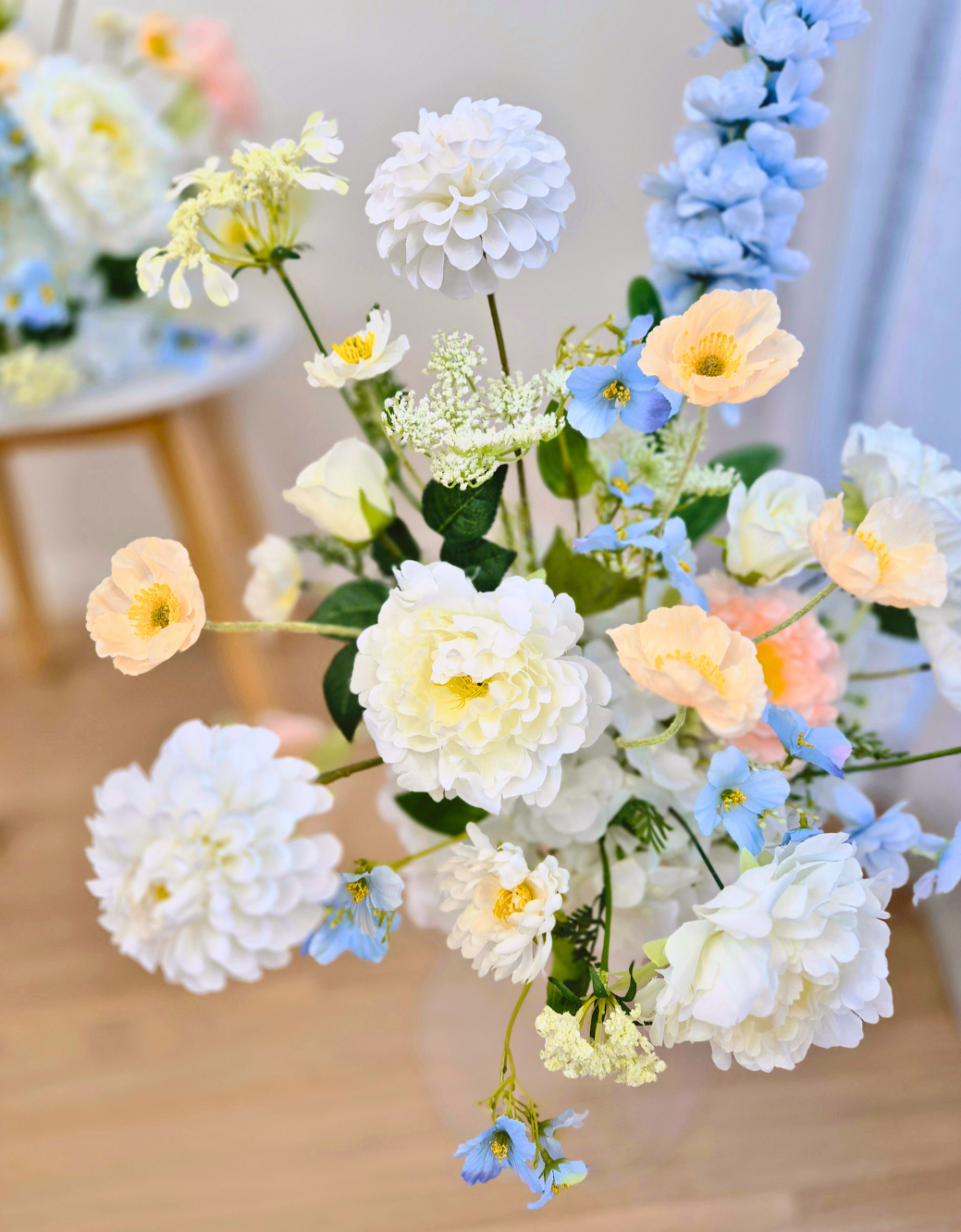 Artificial floral arrangement (front facing) for wedding ceremony, aisle or plinth decoration. Flower cloud made with premium high-quality faux flowers (dahlias, peonies, poppies, wildflowers) in peach & white colours with pops of blue and green.
