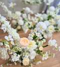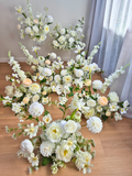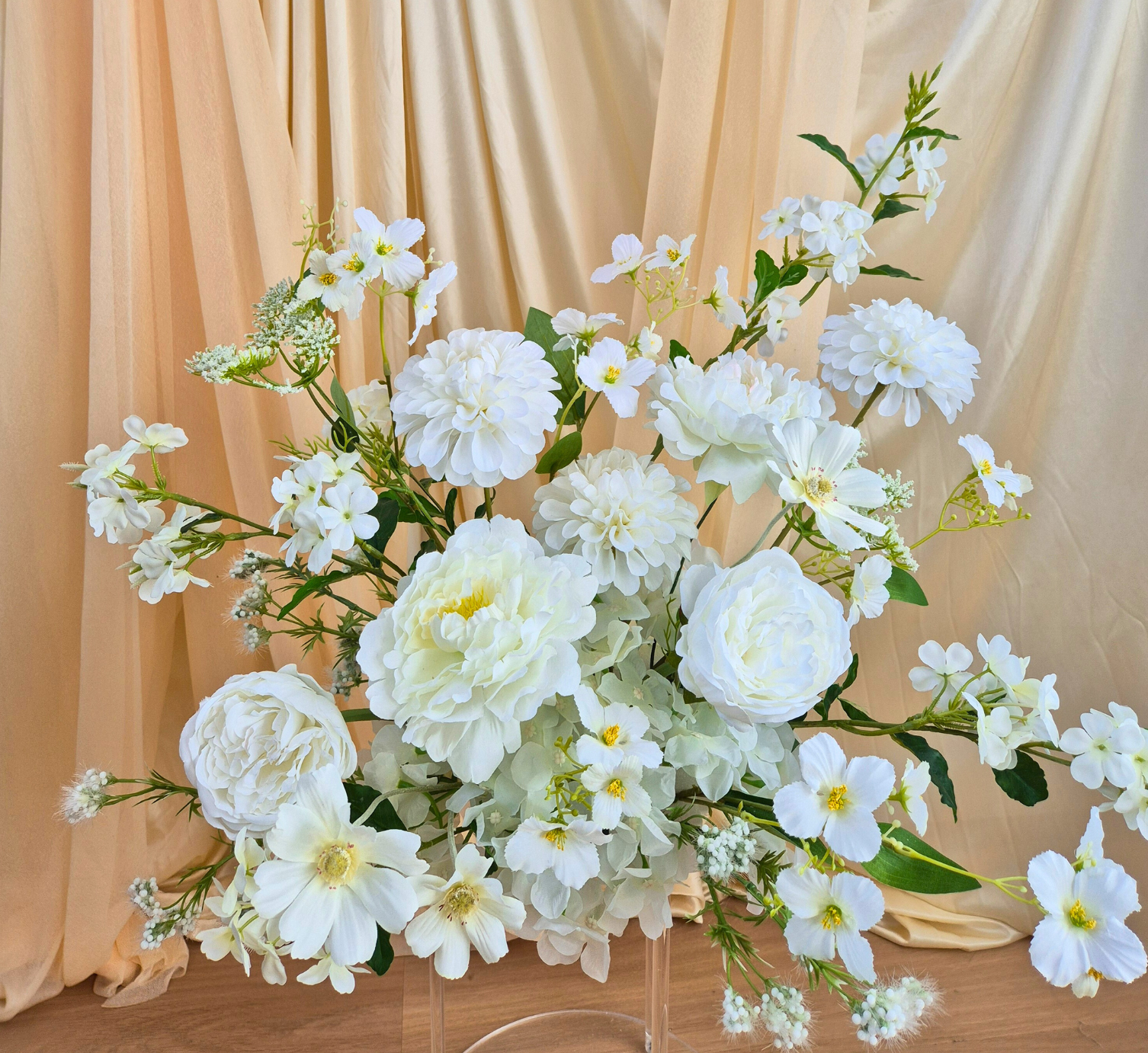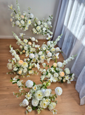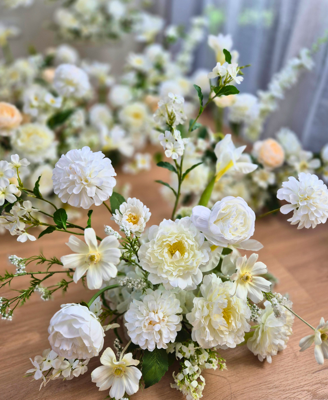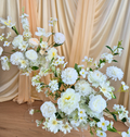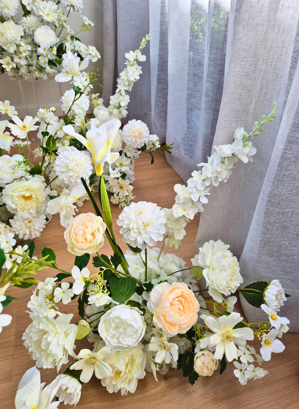 White cream neutral artificial silk floral arrangements (front facing / 1-sided). These flower clouds can be used for aisle, wedding ceremony (floor, ground or plinth) or event styling. Spring wildflowers include ranunculi, dahlias, peonies, roses and assorted wildflowers. Photos show deluxe size. Price is for a single piece.