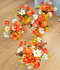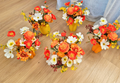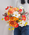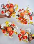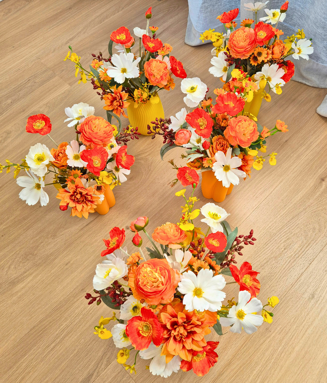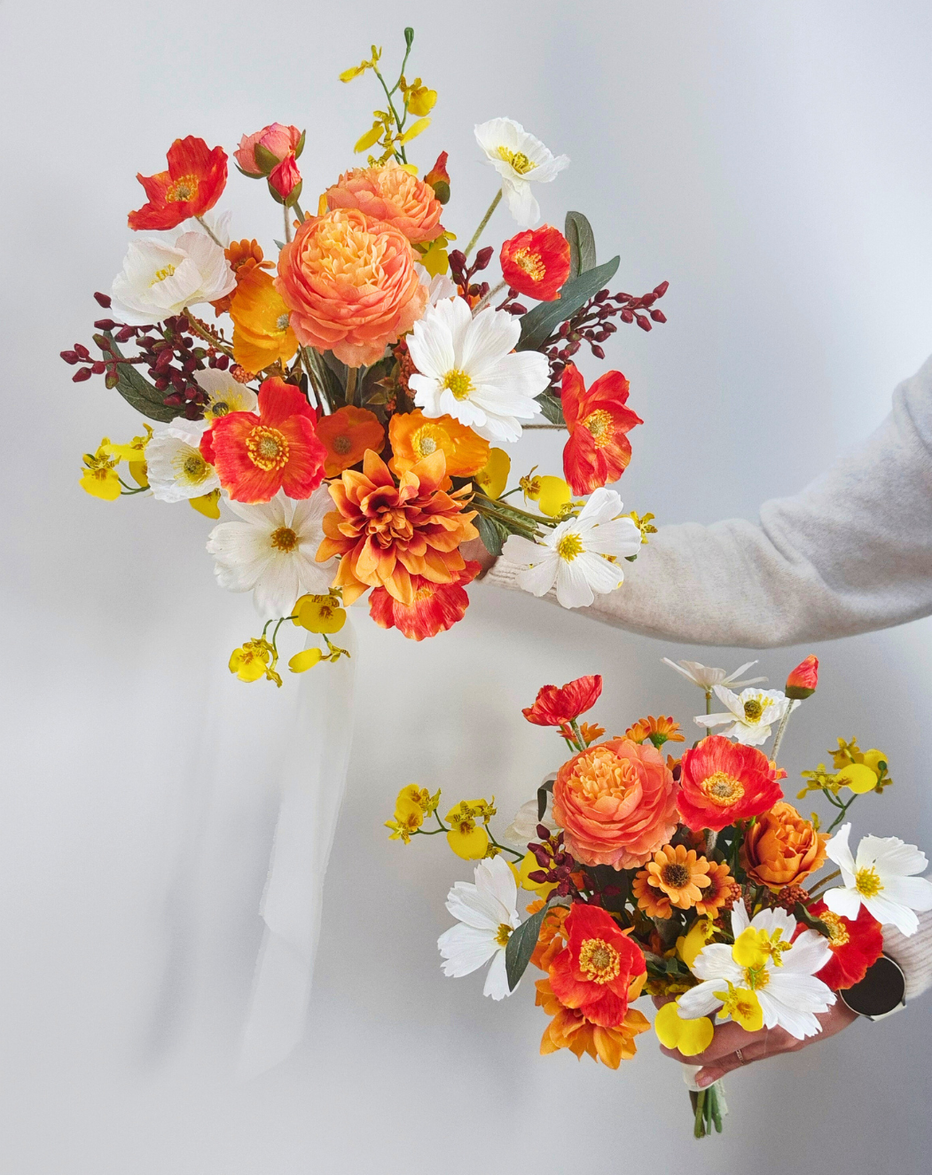 Autumn garden inspired whimsical wildflower bouquet made with premium high-quality faux flowers (poppies, ranunculus, dahlias). Flowers in sunset colours like orange and yellow, with touches of white and deep red/maroon. Shown in the photos are the Bridal and Bridesmaid bouquets.