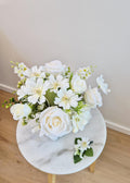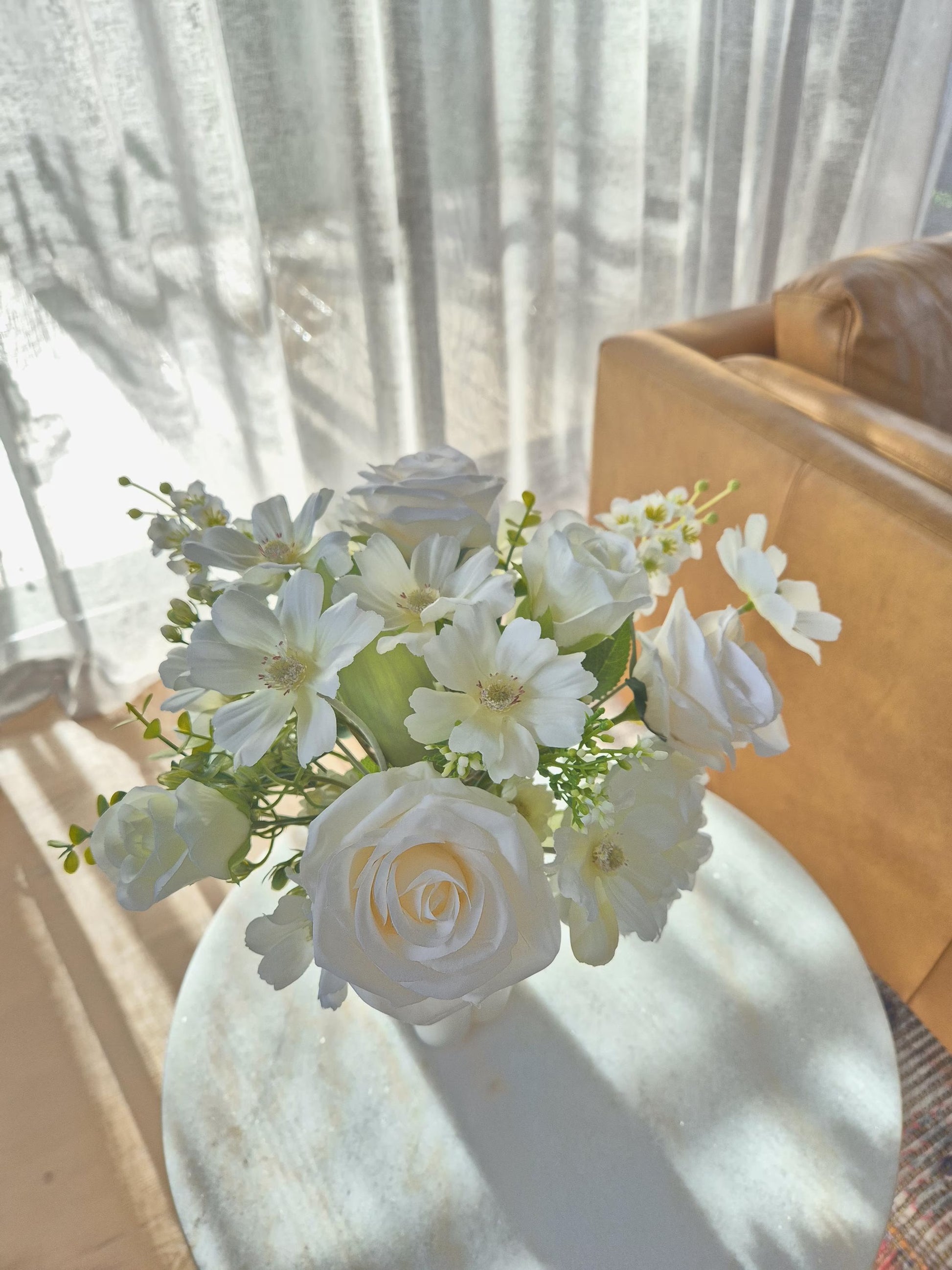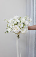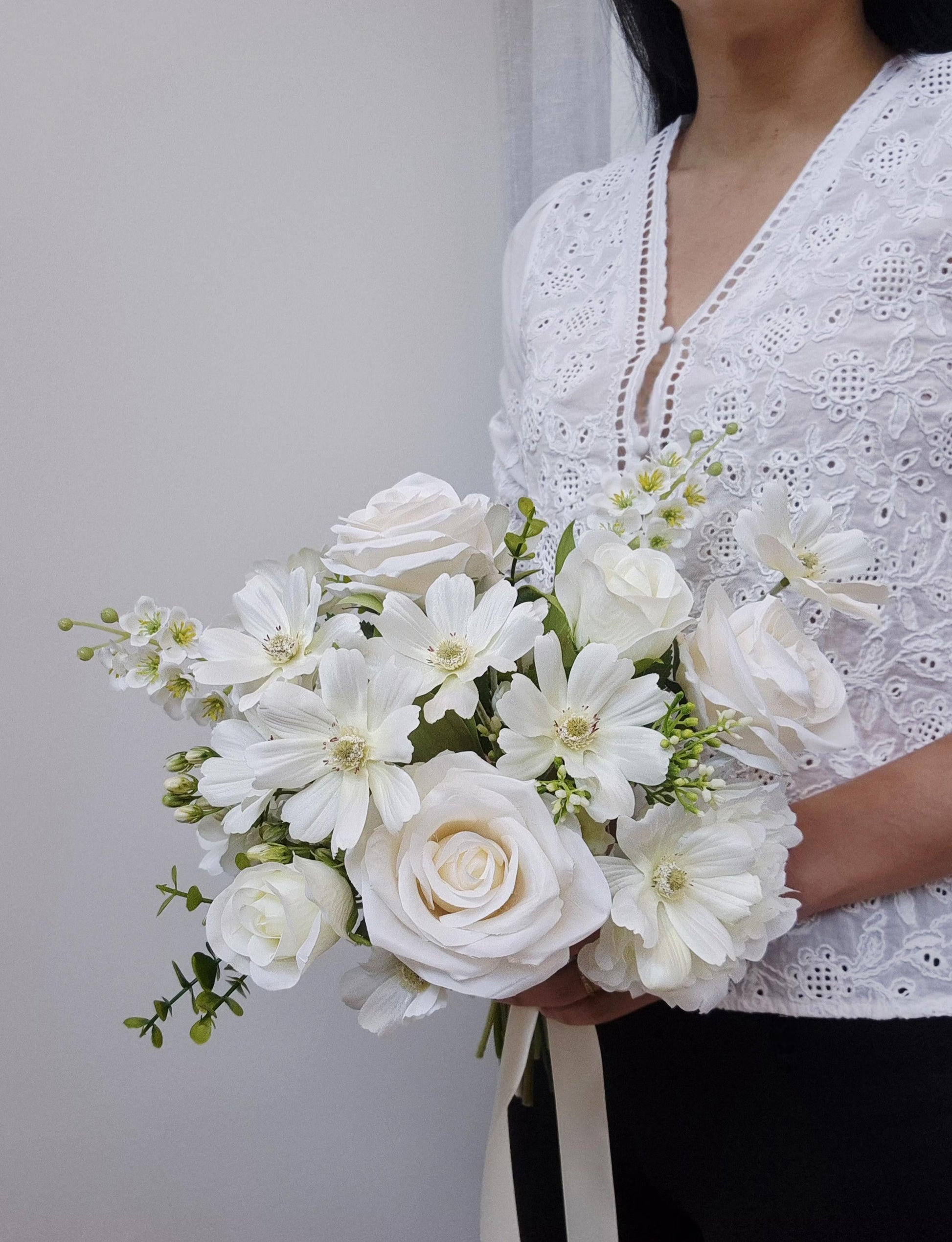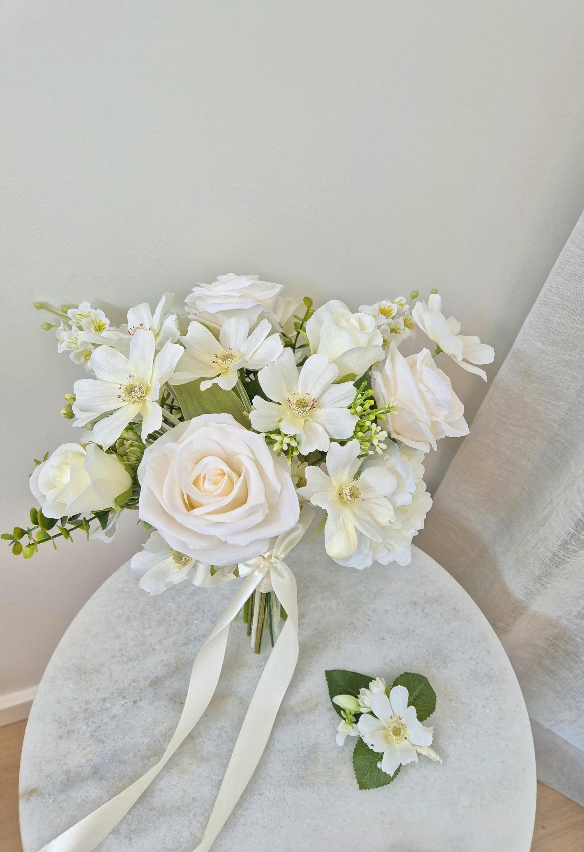 White and green faux wildflower bouquet with white roses, cosmos, lily of the valley flowers. Perfect for an ethereal, minimalist garden wedding style. Pictured in the photos is the Bridal bouquet size.