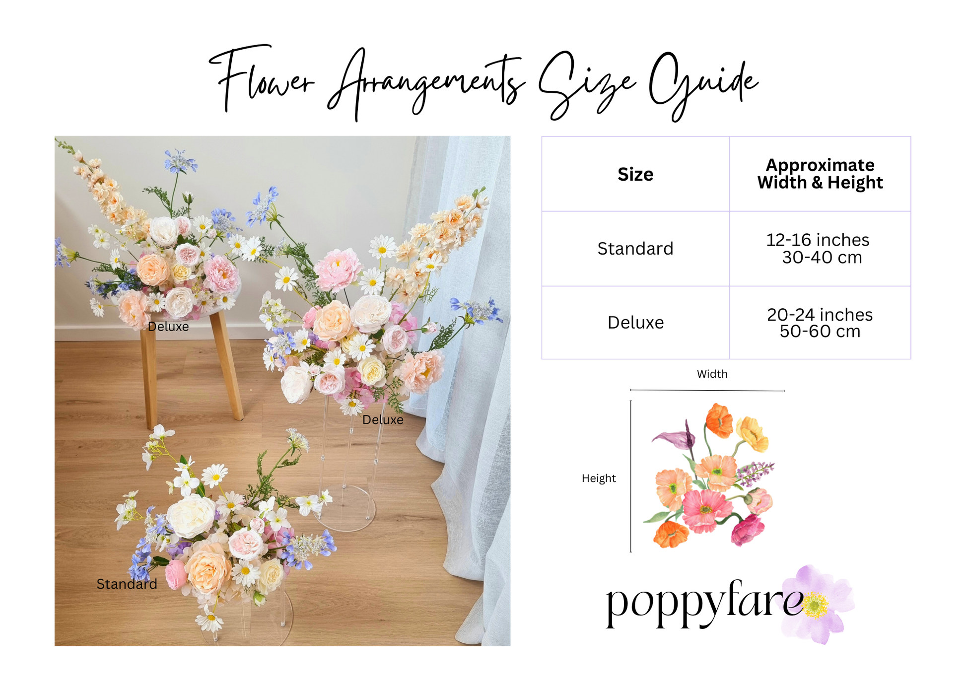 Soft romantic pastel whimsical floral arrangement (front facing) made with premium artificial flowers. These arrangements are suitable for table decor, or can be used as plinth or aisle flowers. A mix of purple /lavender/lilac, peach, pink and white flowers are used in this arrangement. Pictured here are the standard size arrangements.