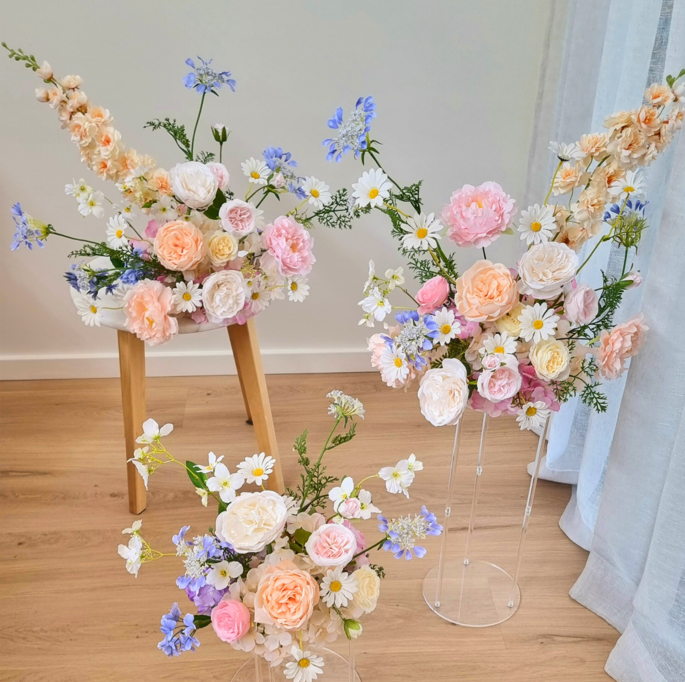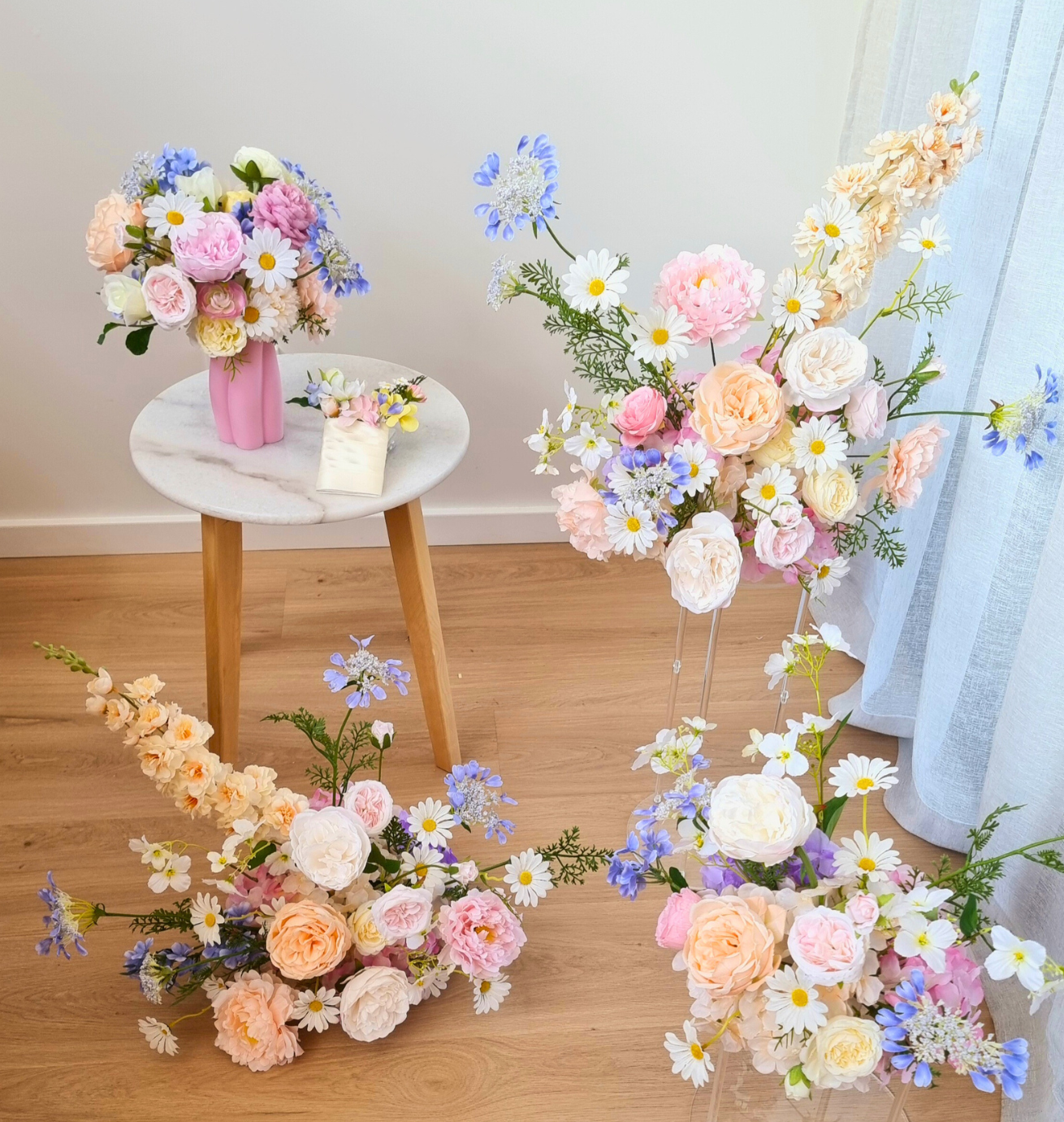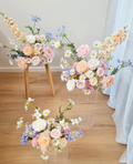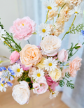Pastel artificial silk floral arrangements (front facing) in a mix of white, yellow, pink and blue colours. Includes an assortment of flowers such as roses, peonies, ranunculus and wildflowers. Photos show a mix of standard and deluxe size. Price is for a single piece. Last photo shows matching bouquet - our Erika bouquet.