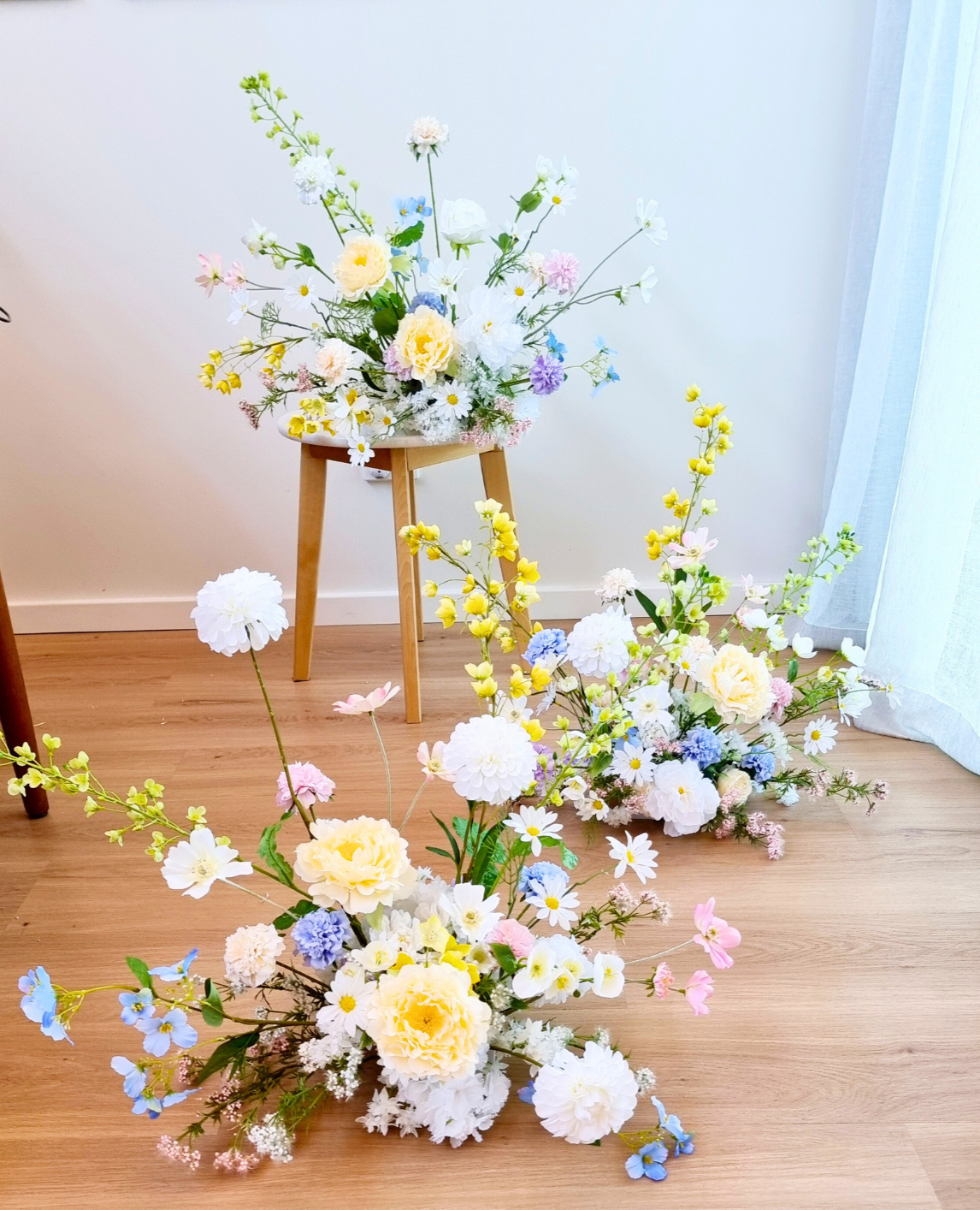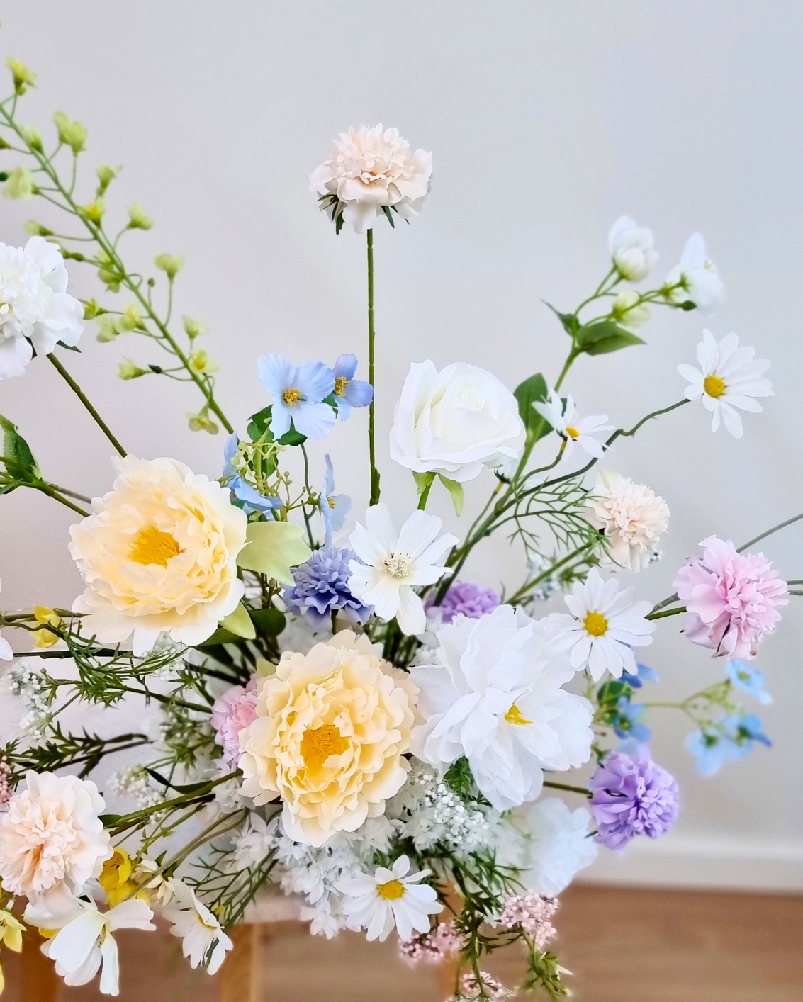 Pastel artificial silk floral arrangements (front facing) in shades of white, yellow, lilac, blue and green. These large flower clouds can be used for aisle, wedding ceremony (floor, ground or plinth) or event styling. The arrangements come ready to be set up for your event or wedding. Photos show deluxe size.