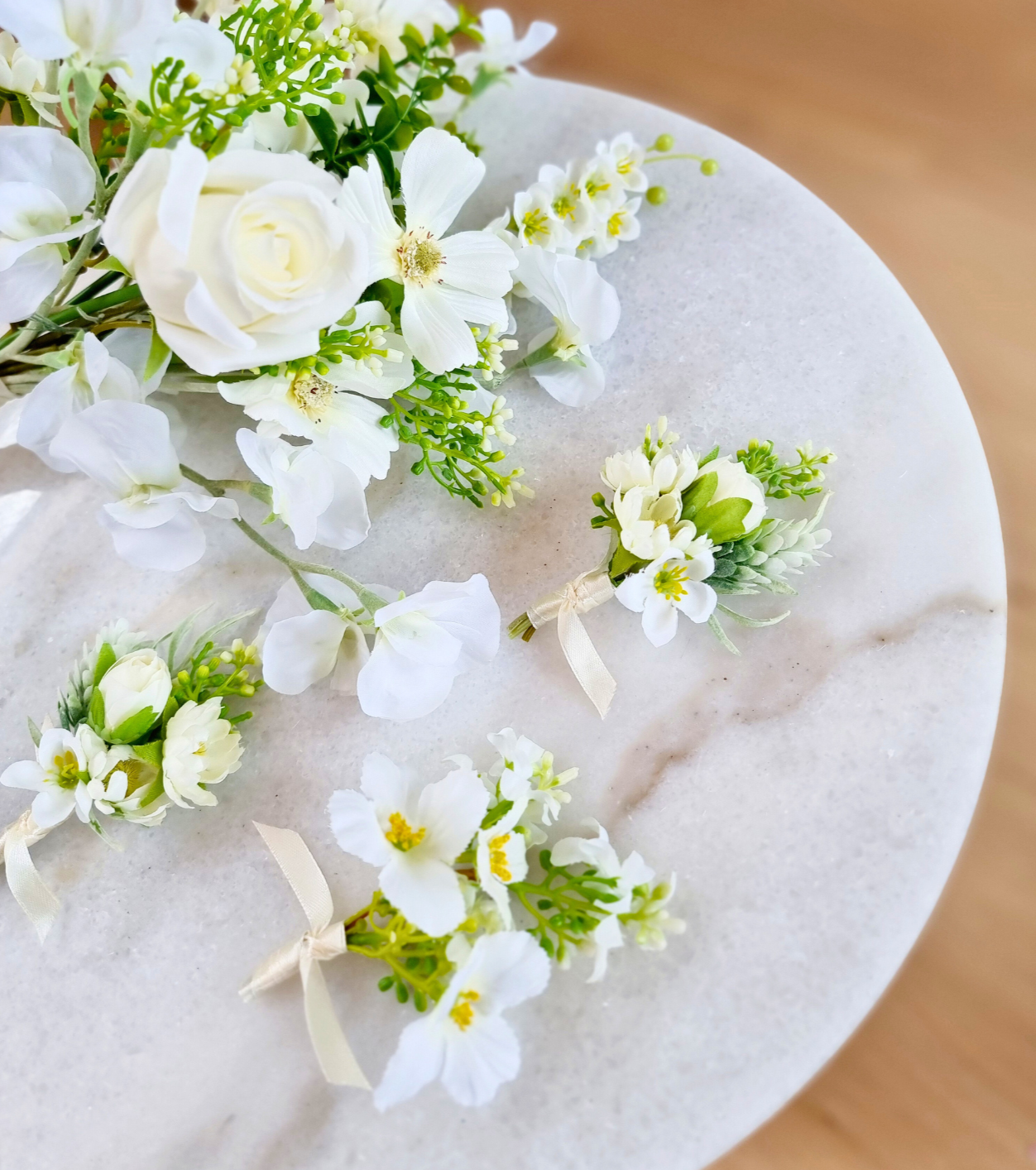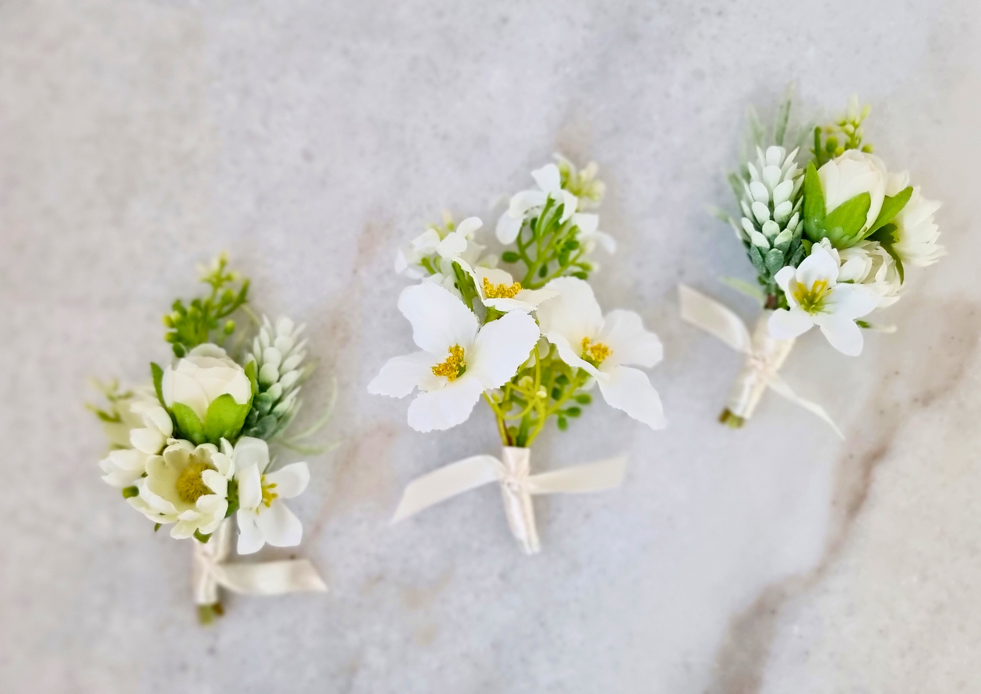 White and green silk wildflower boutonnières and corsages. Minimalist elegance and classic, perfect for a white garden wedding theme. All buttonholes and corsages are finished with ivory colour ribbon.